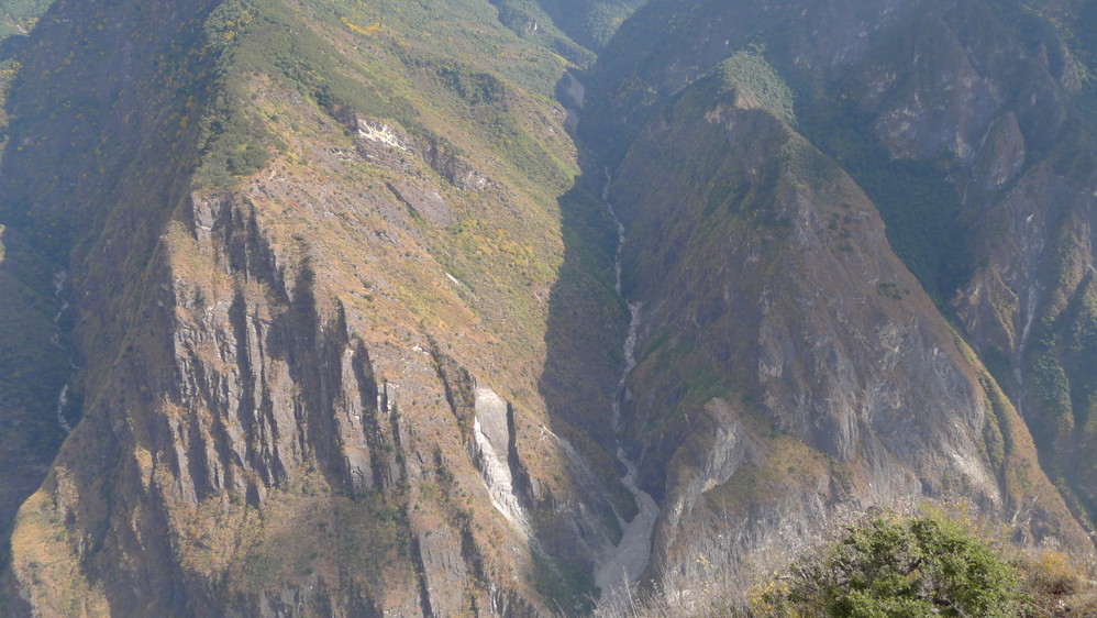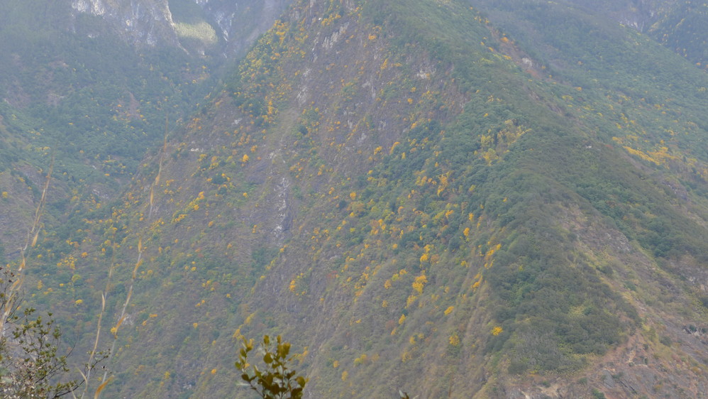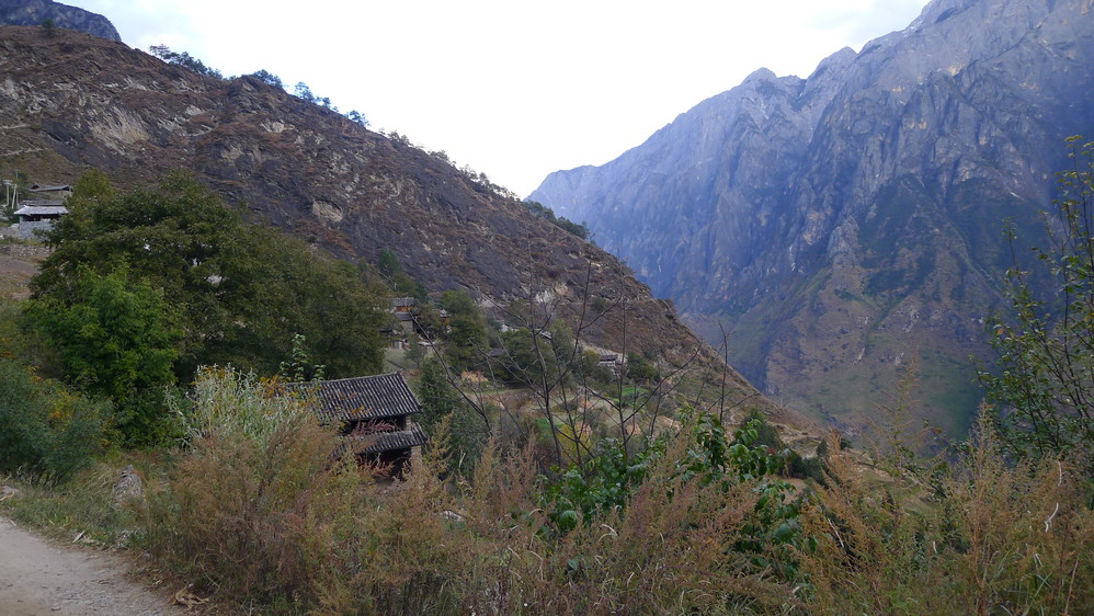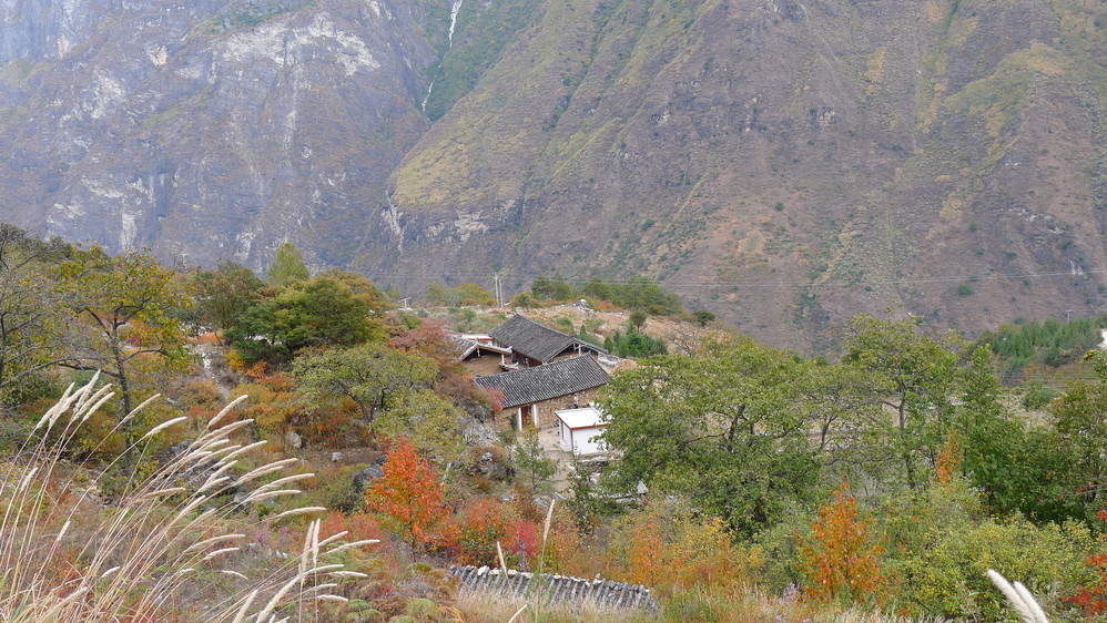 惊险刺激的事情发生了。我到了一户人家,那里写着“中虎跳一线天入口”于是走进去,没人,一只大狗拦住去路,好在是拴着的。找了半天没有找到下去的路,这时候一个老爷爷从房间里面走出来,普通话不太好,比比划划的我算是听了个大概,意思是下去后有一条路会到一线天的。不管了,试试吧。下了坡才发现,几乎没有什么路的,到下面看到一个个老奶奶在干活,应该和刚才那位是一家的,不过看了她一眼我心里一阵发毛,老人家的一只眼睛发青,只微笑不说话,看起来有点阴森恐怖的感觉。肯定是听不懂我说的话了,只好自己找路了。根本没有路,只看到下面很远的地方有黄色的小土路,不过怎么过去呢?于是我发扬了披荆斩棘的开拓者精神,在灌木丛里面穿行,而灌木丛里面有那种石头垒起来的不明物体,会不会是当地人的坟墓?背后一阵发凉,心里默念着“打扰了打扰了”想尽快走到小路那里,费了九牛二虎之力,终于到了那条小路,心里终于踏实了,刚才还在想,那个老奶奶会不会拿着镰刀突然出现在我面前?哈哈,恐怖小说看多了!