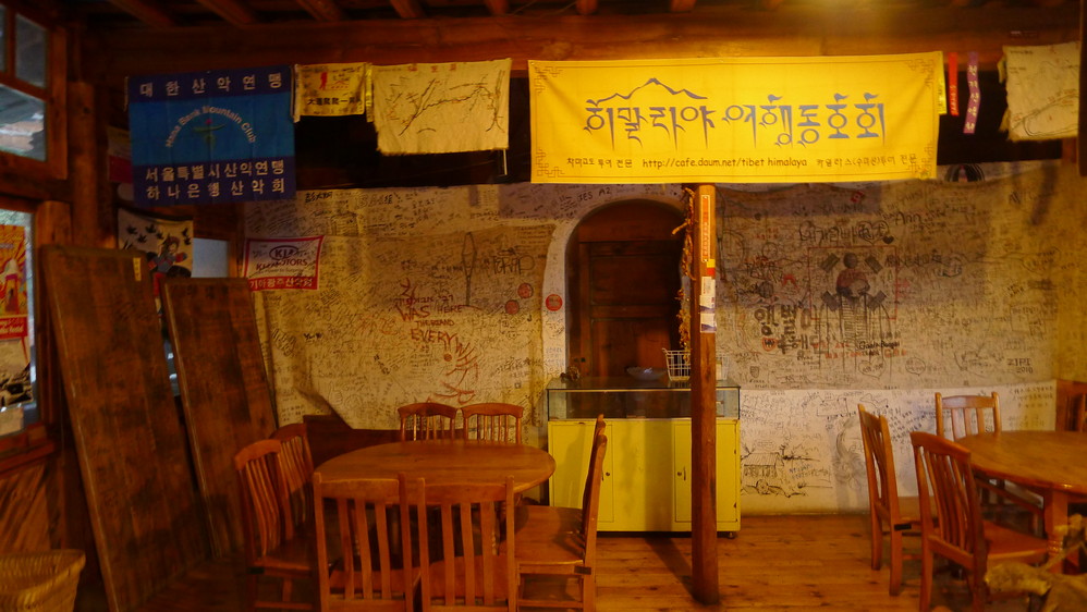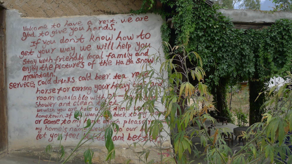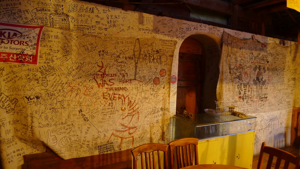 晚餐点了几个家常菜,味道不怎么样,在这种环境下也只能将就了。吃完饭,有人在墙壁上留言,老外们还在喝酒聊天。一天的行程还是很累的,而且天黑之后,非常冷,我的衣服在赶路时因为出汗已经湿了,又没带换洗的衣服,只能早早的洗漱,然后