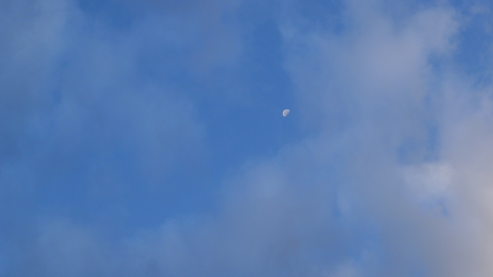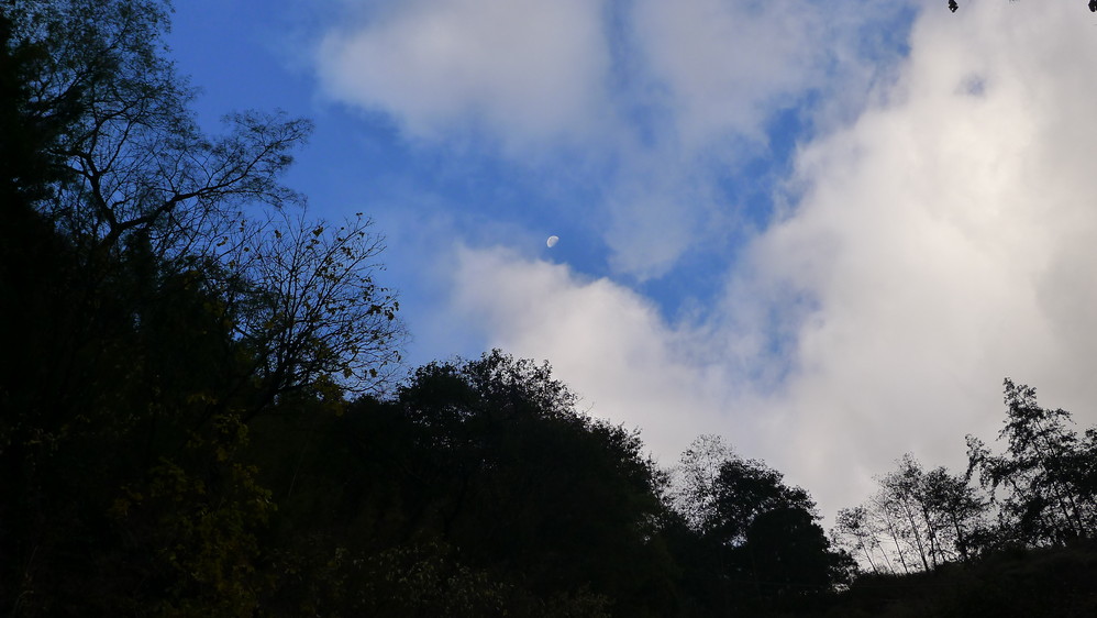抬起头,一弯明月挂在蓝天上白云间