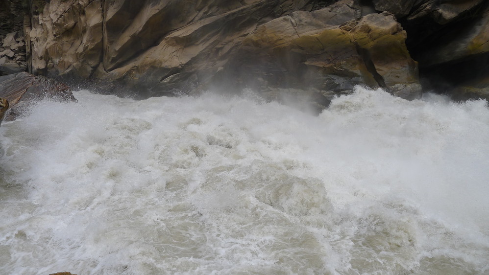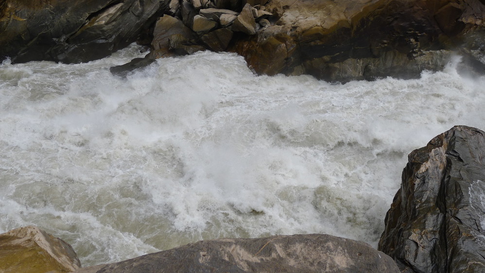 虽然现在不是雨季,但是金沙江 的水还是非常的壮观,金黄色的江水奔腾而来,拍打着两岸的岩石。