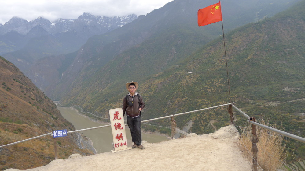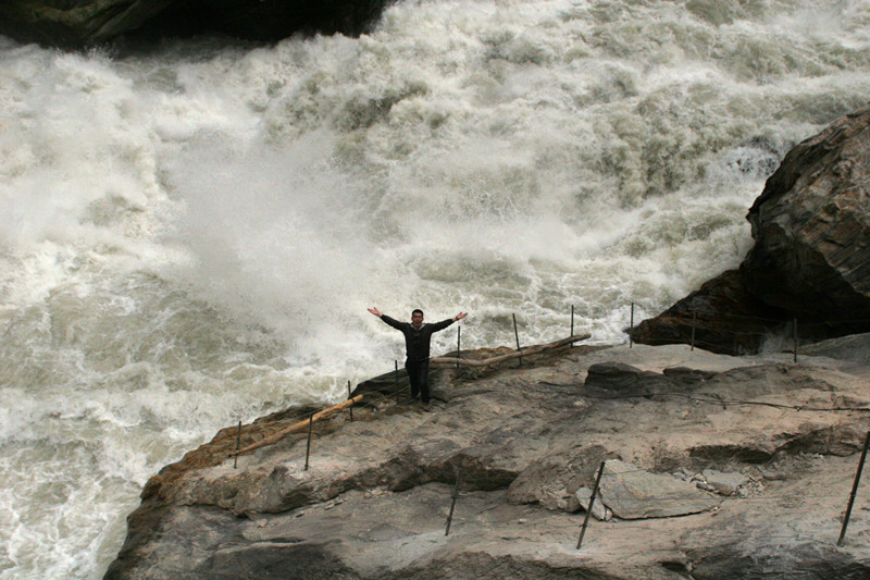 我也登上了虎跳石,站在那里感受着气势磅破的金沙江 ,久久不愿离去。我下去的时候基本没什么人了,有一个MM在等她的朋友,于是请她帮忙拍了一张以江水为背景的照片,算是留念。