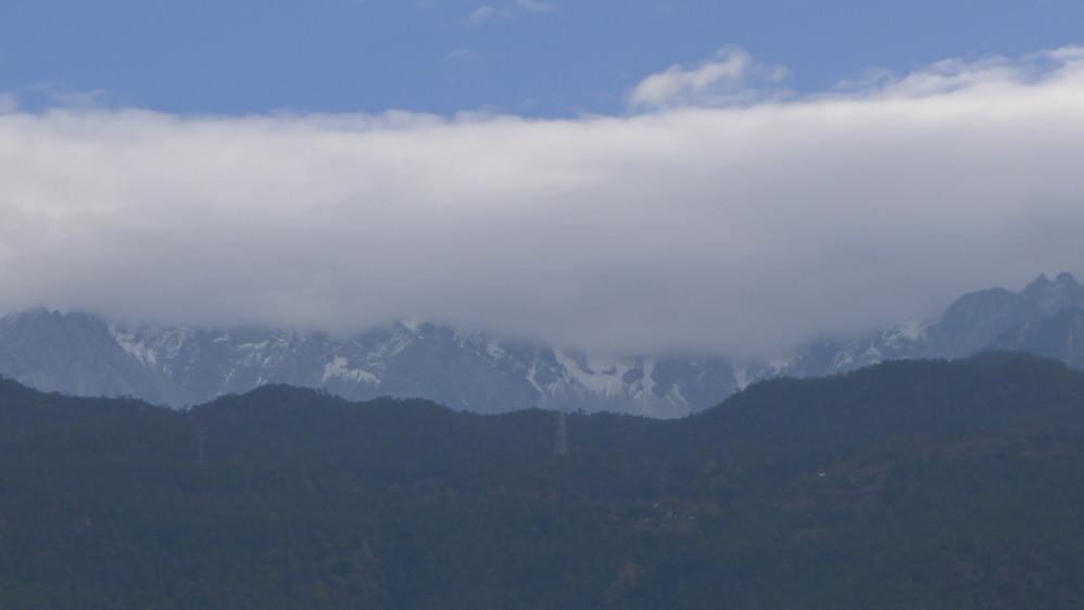 对面的玉龙雪山 连绵的山峰,云雾笼罩在山顶,增添了更多的神秘色彩,山神是否正在隐藏在云雾里面山峰上俯瞰众生?