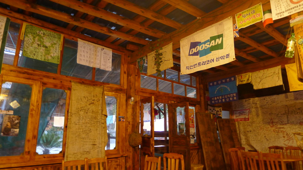 halfway的餐厅,挂满了各个国家旅行社的旗帜和游客的留言,不过没看到有国内的旅行社旗 子。