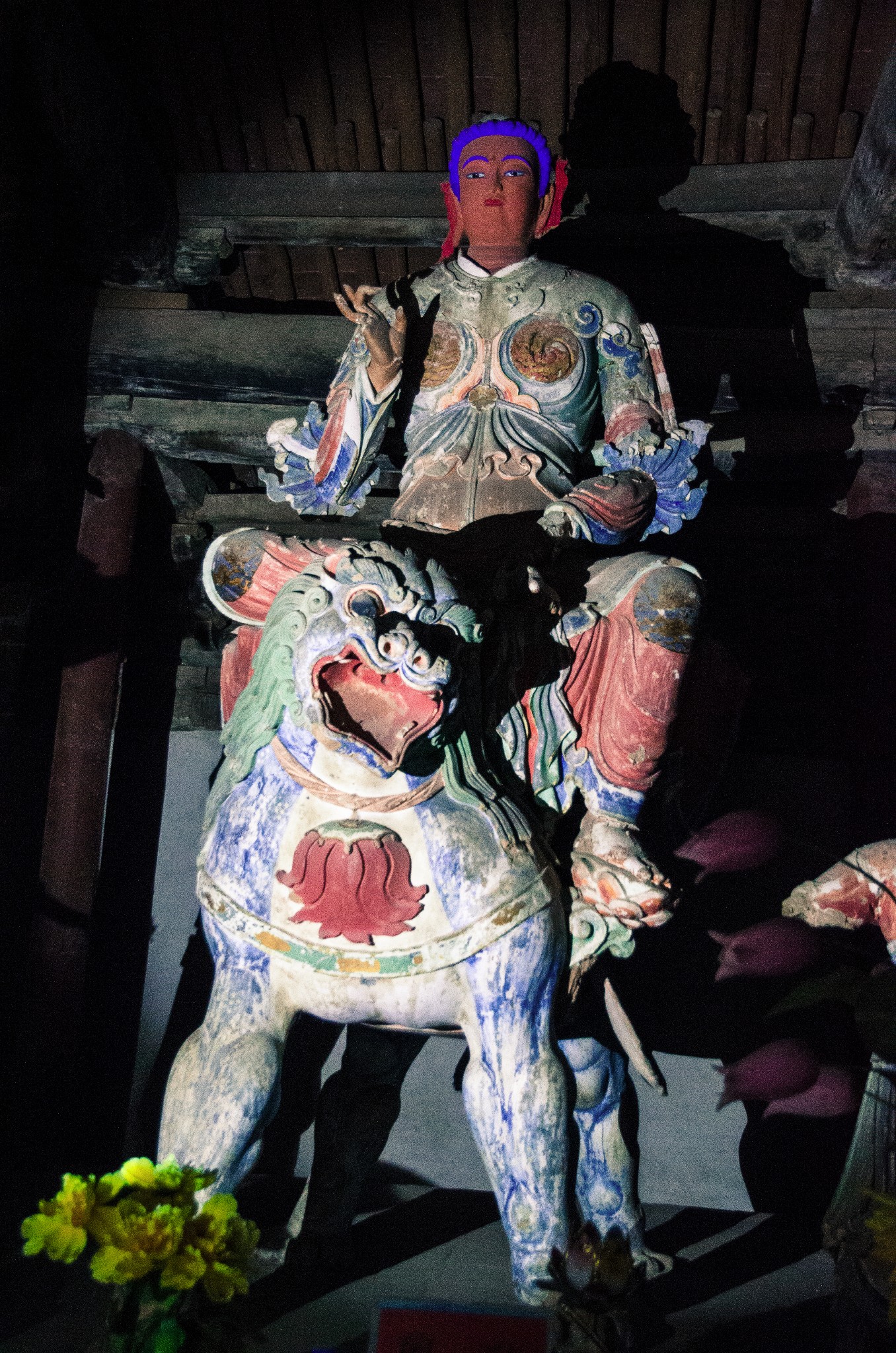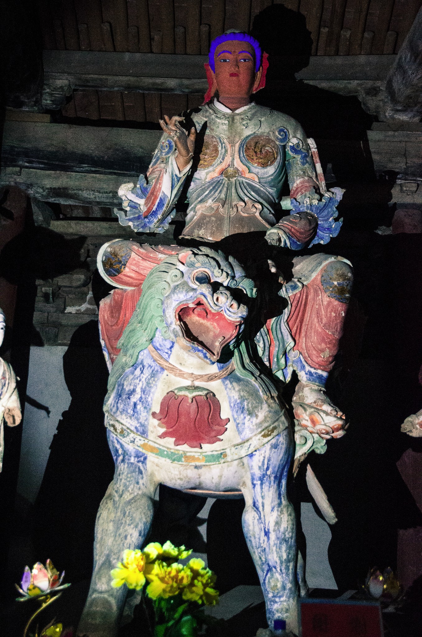 主尊文殊菩萨居中,骑狻猊,右前侧是善财童子,左前侧是驭者于阗王,再向外两侧塑2尊胁侍菩萨。右外侧佛陀波利,左外侧是圣老人,佛坛前两侧左为韦驮护法,右为护法金刚多罗天王。