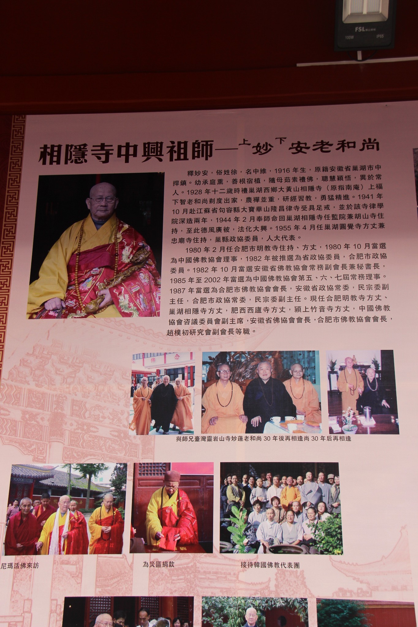 妙安法师现年101岁,早年受家庭影响,信仰佛教,为人善良,12岁在指南庵也就是现在的相隐寺出家。现在是安徽省与合肥市的佛教协会会长,明教寺方丈。两年前我在明教寺还看见过他,他在椅子上晒太阳,一言不发,默默注视来往的人,精神很好。