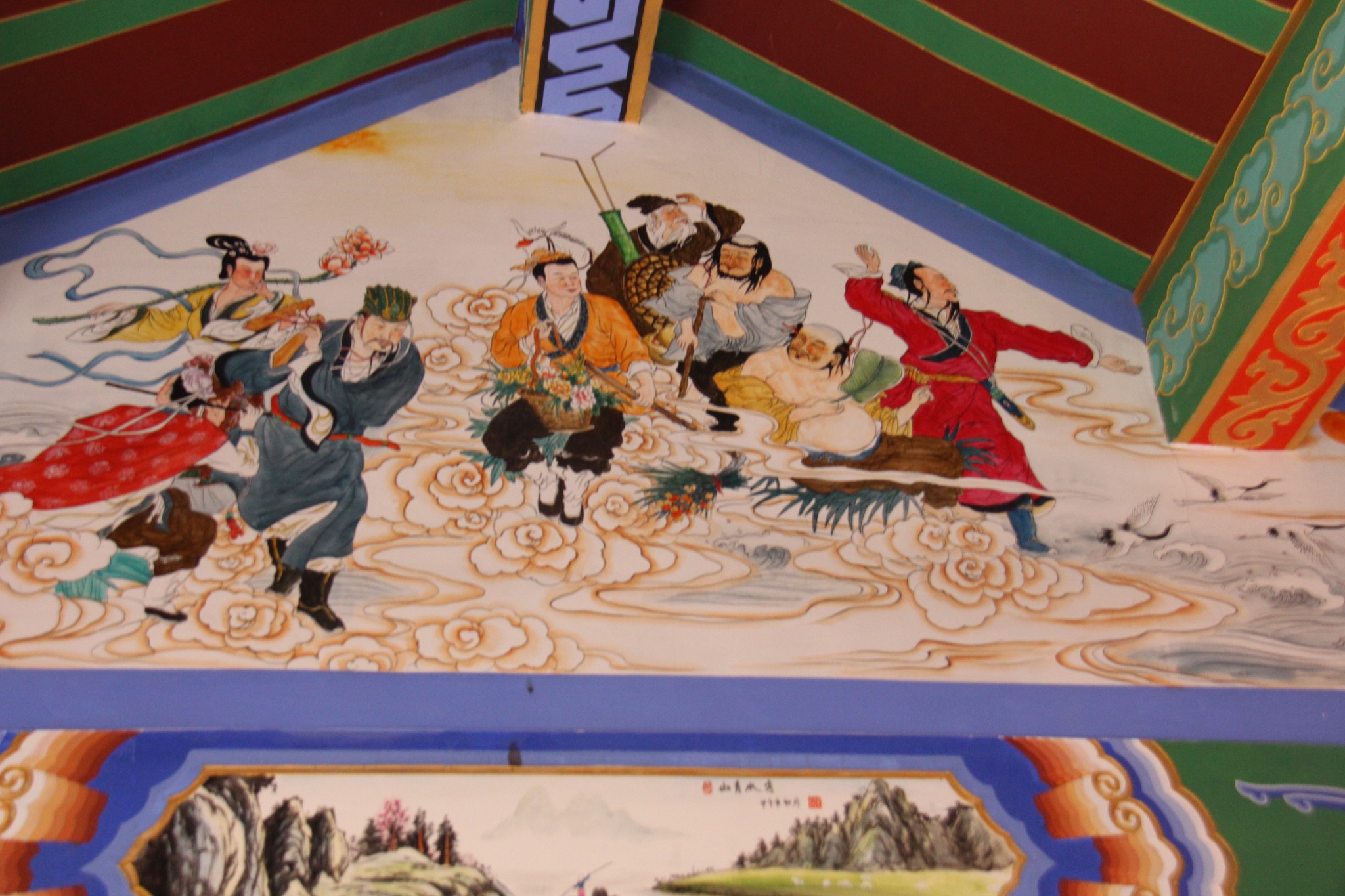 寺庙东西两边院落的长廊中有很多彩绘壁画,居然还有道教壁画八仙过海。