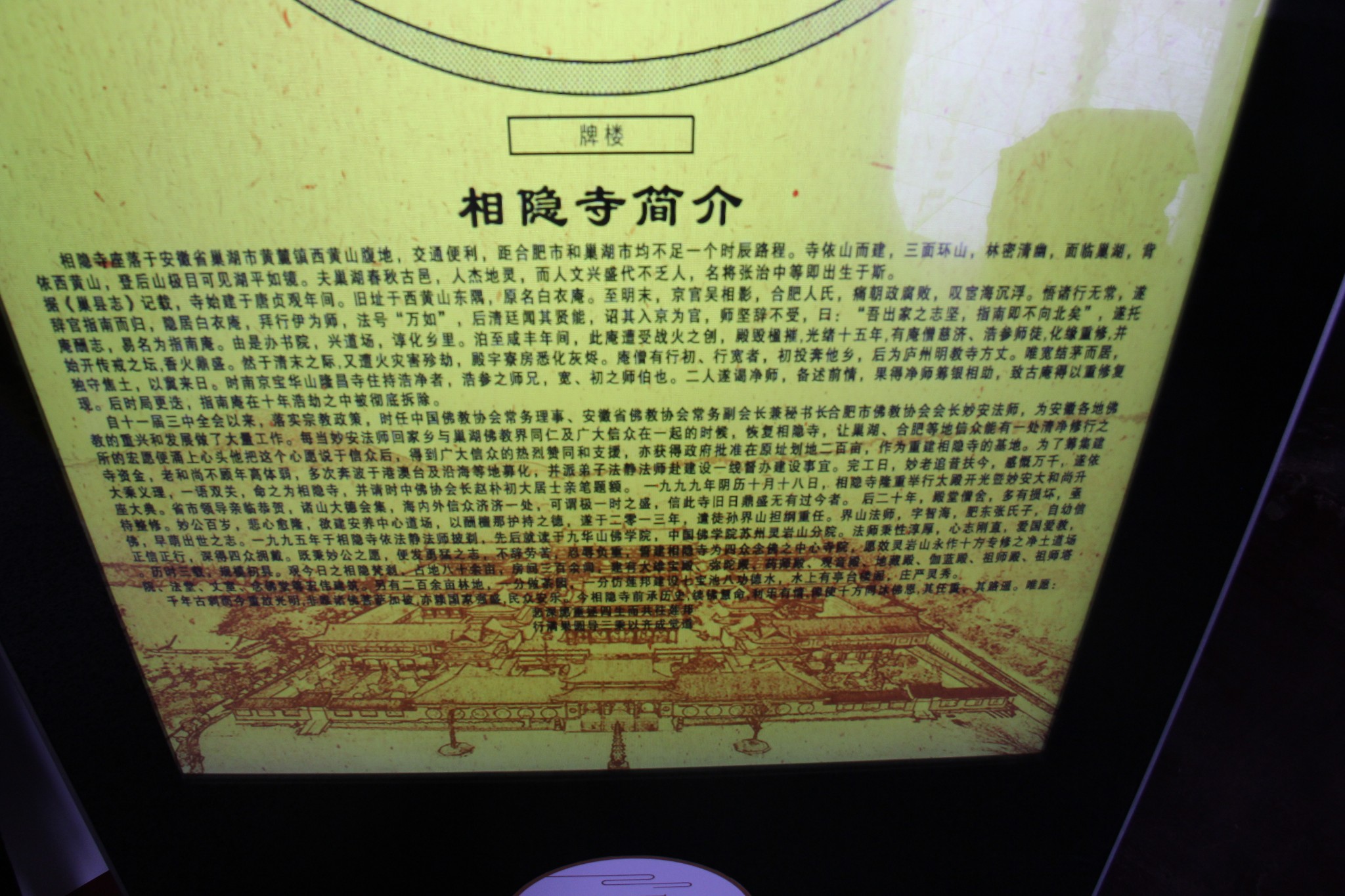 黄麓相隐寺位于安徽省巢湖之滨的西黄山腹地,曾经是一座高僧辈出的古刹,原名"白衣庵",始建于唐朝贞观年间,明朝末年,遗臣吴相(祖籍合肥人)目睹世事沧桑,以及明朝没落衰亡景象,回到故乡愤世出家,隐居于白衣庵。后清朝康熙皇帝派人延请其出山,帮助治理朝政,未得应允,并说:"吾出家之志坚,指南即不向北矣!"由此则将白衣庵更名为"指南庵"。吴相即更法名万如。因其住於该寺,一九九一年妙安法师重修时遂改寺名为「相隐寺」。万如法师於此设书院执教,学生有四十八人,此后大师创丛林,兴道场,香火日盛。清咸丰三年1853年,相隐寺毁於战火。(当时太平军在合肥地区是见到与传统信仰有关的佛寺、道观和祠堂一律毁掉,冬天拆古建木构件取暖)光绪十五年1879年,由镇江句容宝华山隆昌律寺任住持的浩净老和尚及行宽和尚共同修复。1949年后,相隐寺被彻底拆除。1991年时任安徽省佛协副会长,合肥明教寺方丈的妙安大师首倡重兴古庵,赖宗教政策扶持,信众一心,蒙政府批准于现址重建。完工日,妙老追昔扶今,感慨万千,遂依大乘义理,一语双关,命之为相隐寺(既有宰相隐居义,又具大乘无相之义)。