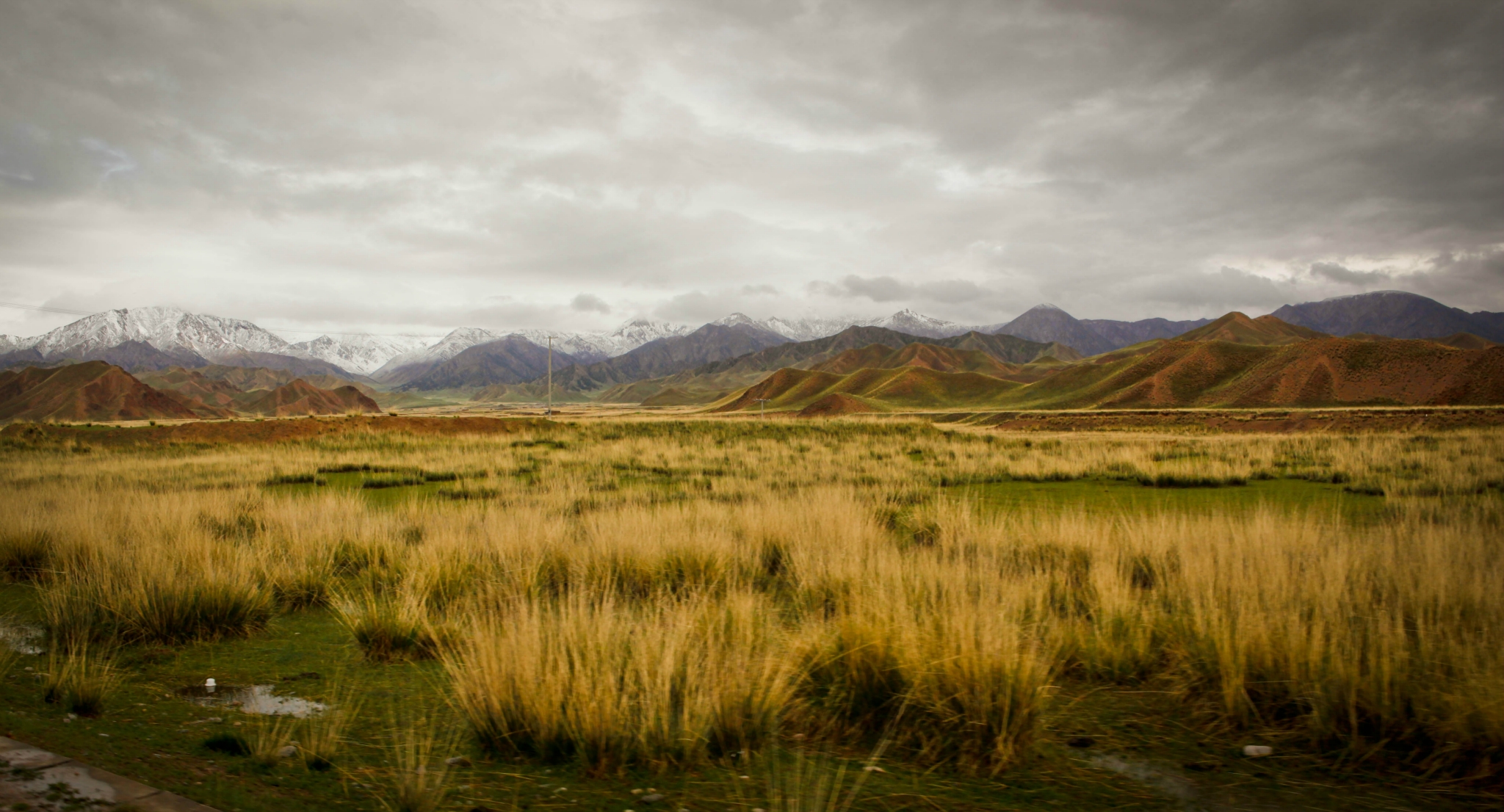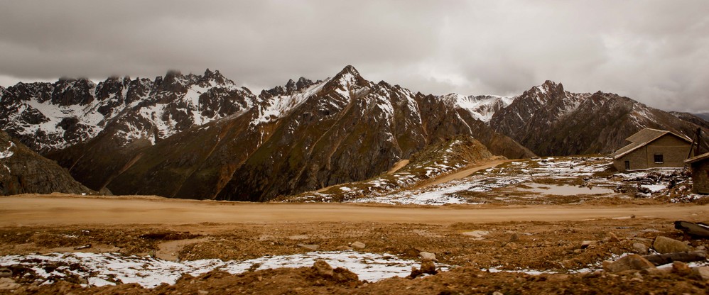 天还是隐隐的,见不到太阳。灰黑色的云彩下面,是一如既往连片的雪山和枯黄的草甸,冰冰冷冷的.