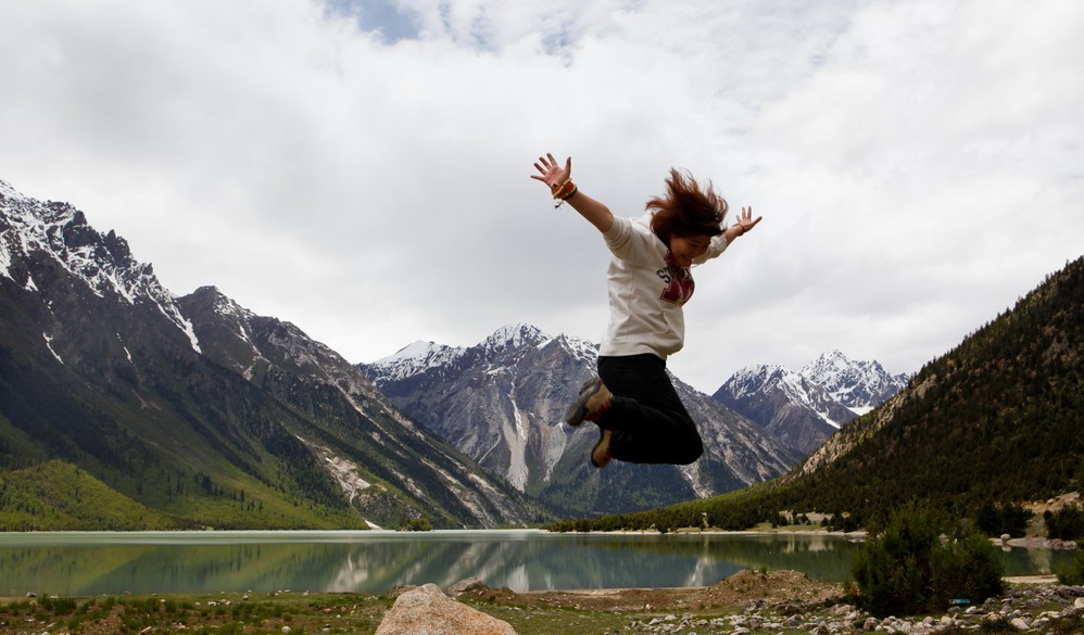 话说好了伤疤忘了疼,绝对是我人生不可回避的座右铭。在川藏之行的首日,自以为吃了止疼药就全无不适的自己,忽悠了同伴在海拔5K左右的神湖边,玩起了蹦蹦跳跳的勾当。不知道是为什么,在这种天高云淡的地方,我总像是想用跳跃来释放那颗被美景陶醉了的心。