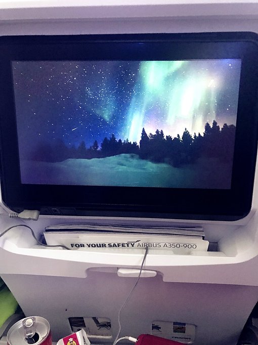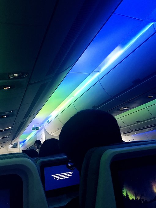 头顶上蓝绿交替的极光氛围灯,座椅屏幕上播放着极光的视频,机舱都变得宁静下来。