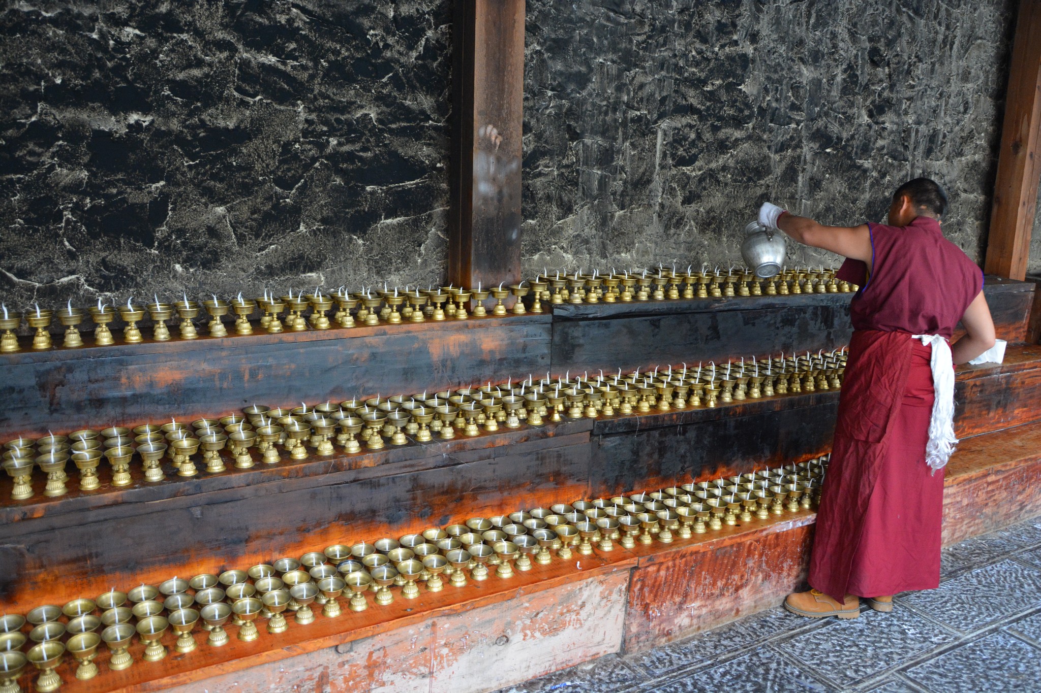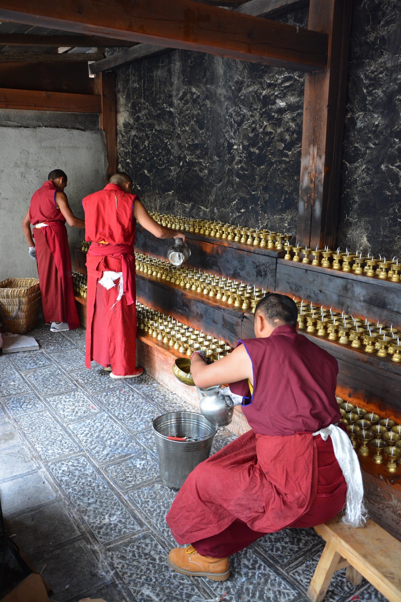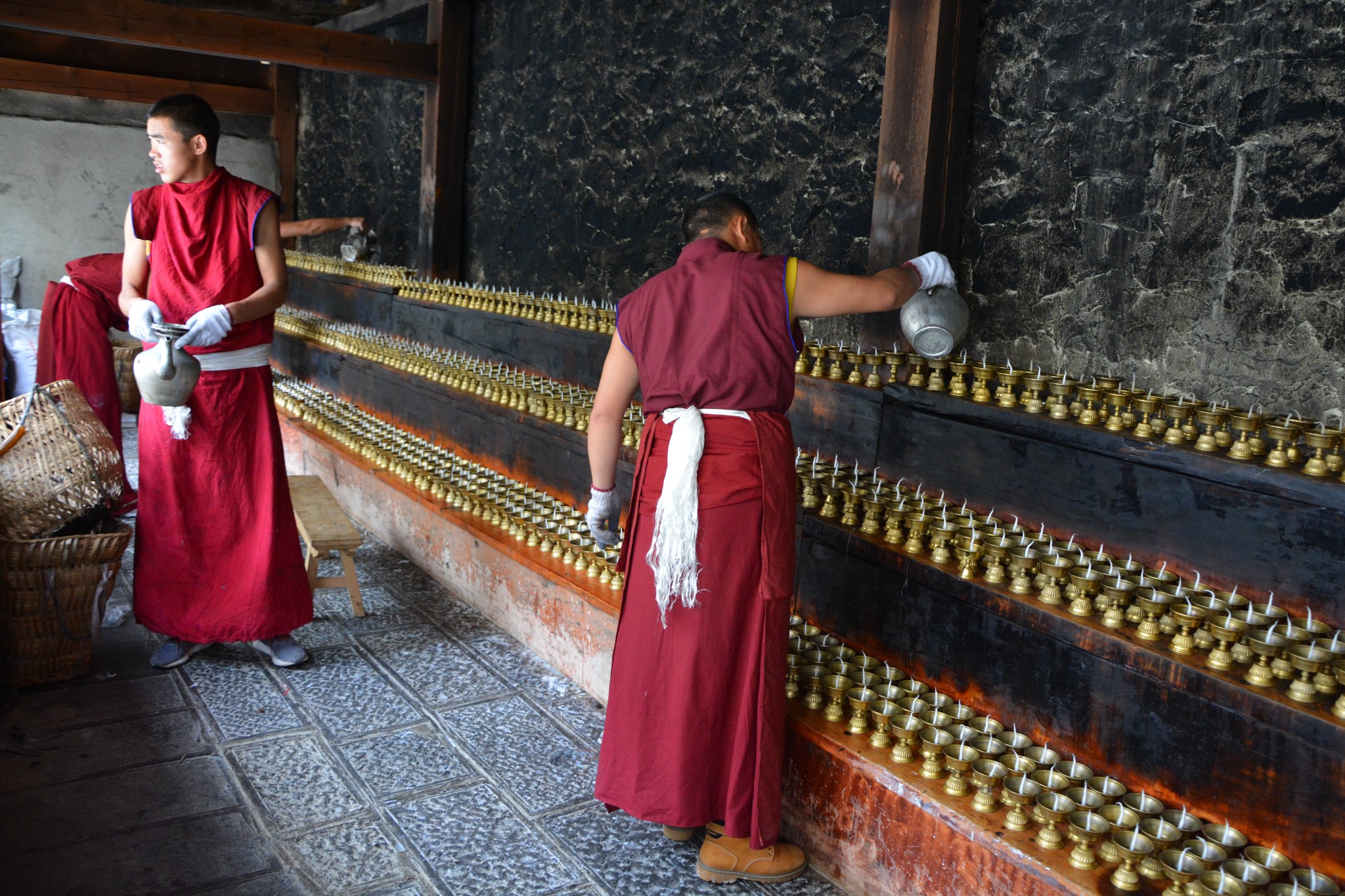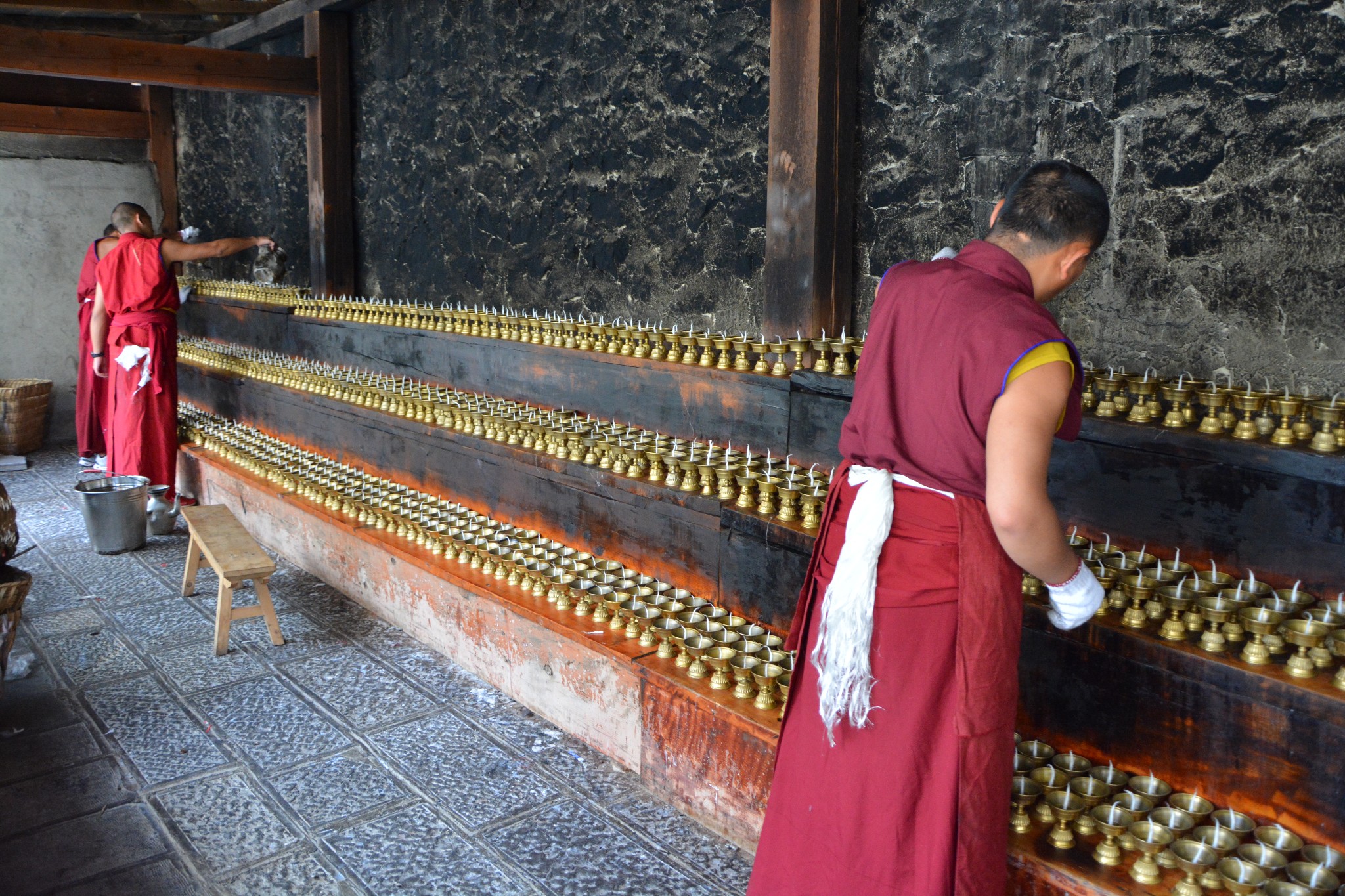 松赞林寺内到处飘荡着甜腻的酥油气息,对于不习惯酥油味道的人来说,这真是一次嗅觉的洗礼和升华。幽暗的大殿内,点点灯火在佛前摇曳,光影游弋,佛影重重,色彩浓重和隐晦的藏传佛教给人带来感官上的巨大冲击,宛若佛陀的金刚杵已然临头,由不得你不发自内心的信仰。
