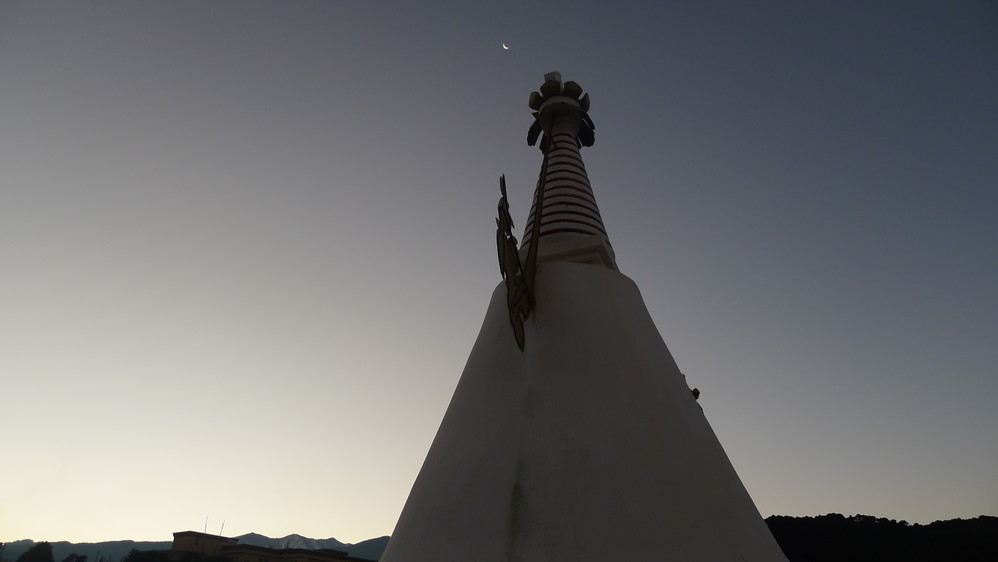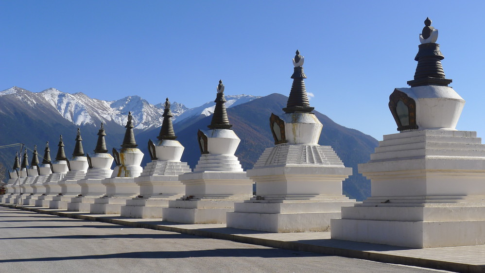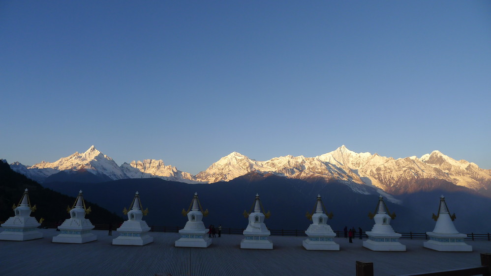 观景台上十三座白塔一字排开,十三座白塔象征着梅里十三峰。
