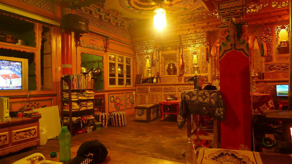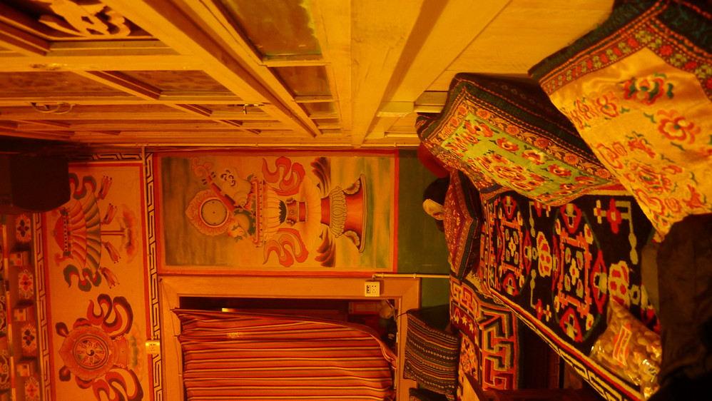 回到青旅后,来到大厅休息,这个大厅也是藏族风格的,色彩艳丽。屋子里面有个大火炉,在这里面呆着感觉好像氧气不足,呼吸都有些困难。