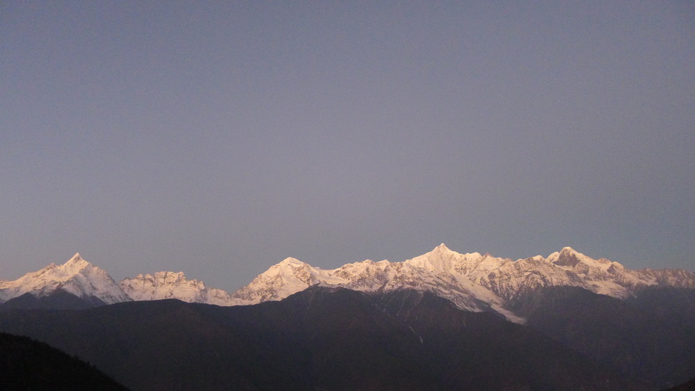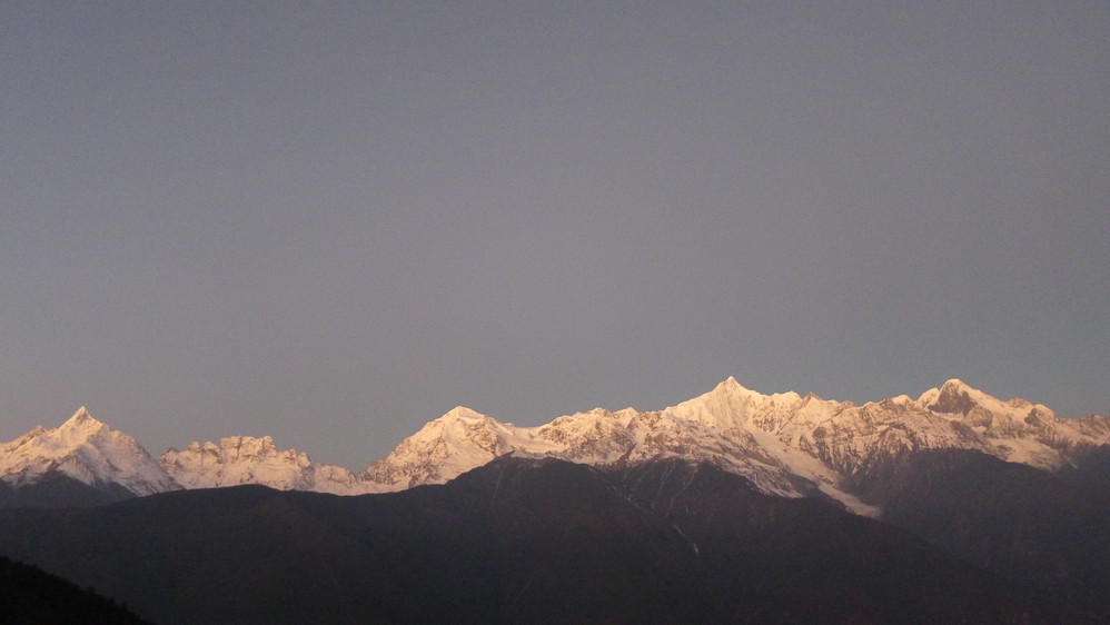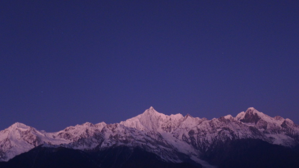 第二天7点就爬起来看期待已久的日照 金山 。这个时候天刚朦朦亮,观景台上已经聚集了很多人,雪山发出清冷的光芒,一颗星星还在闪烁。