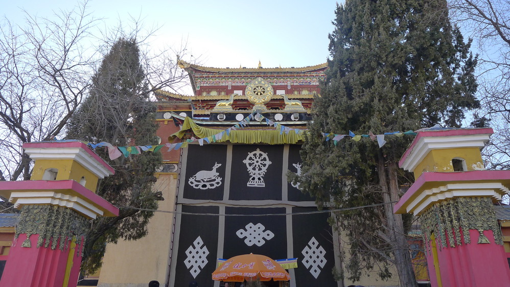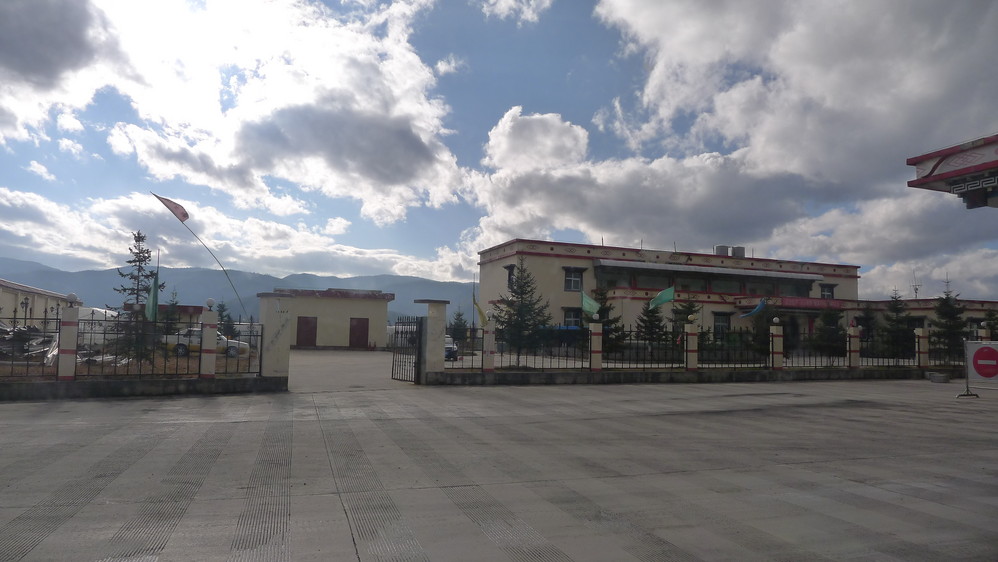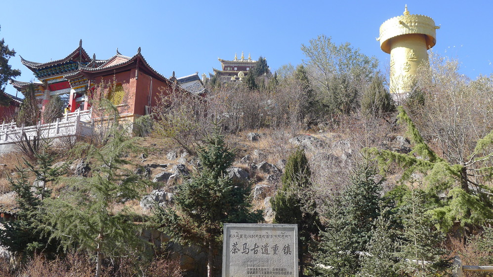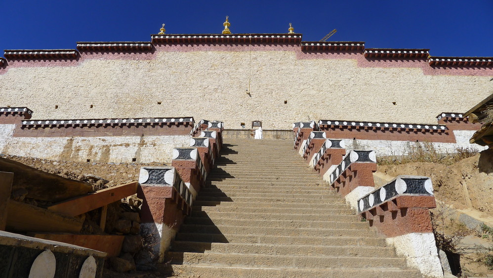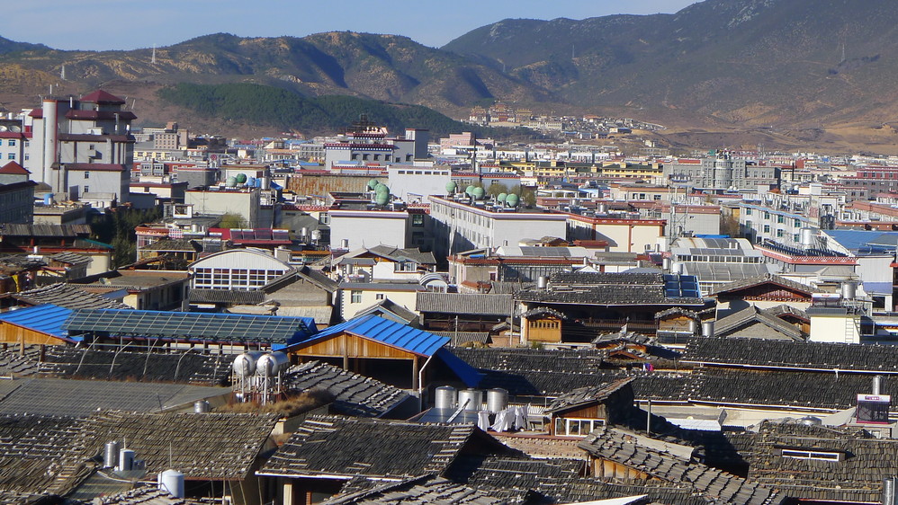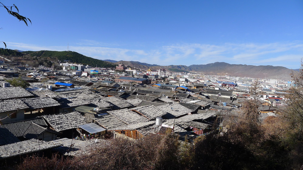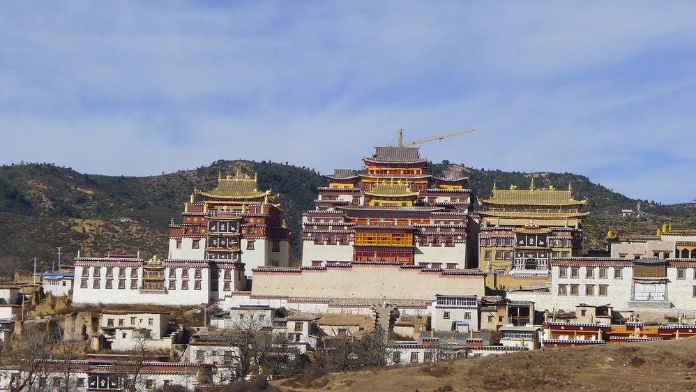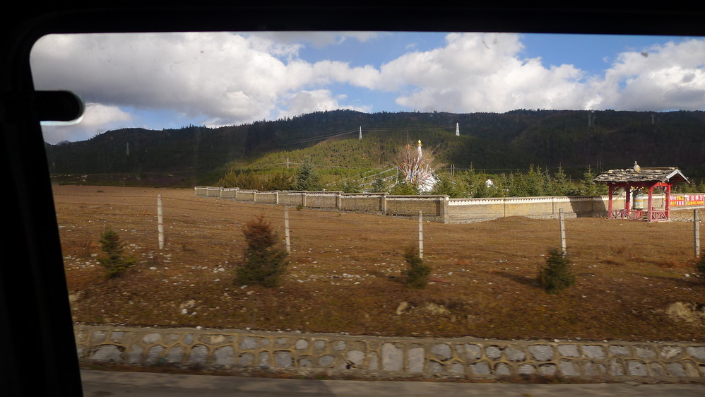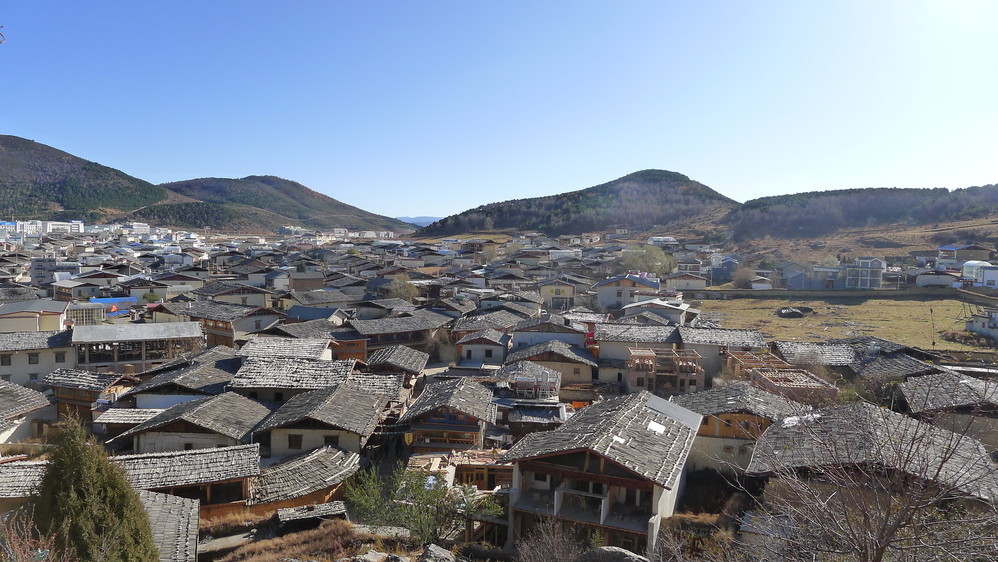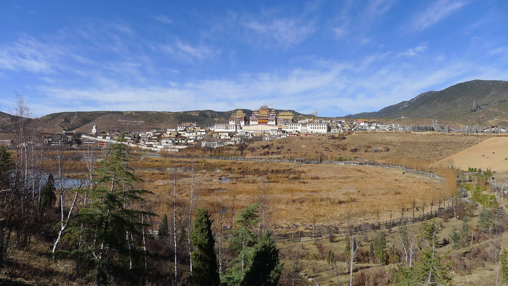 在松赞林寺对面的观景台远眺松赞林寺。寺对面的山坡上,有一个天葬台,是进行天葬的地方。