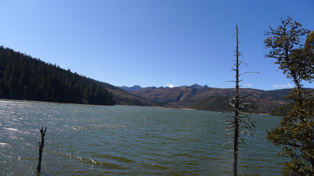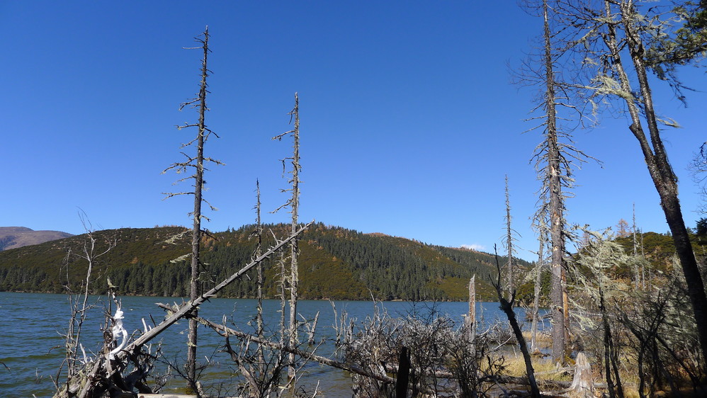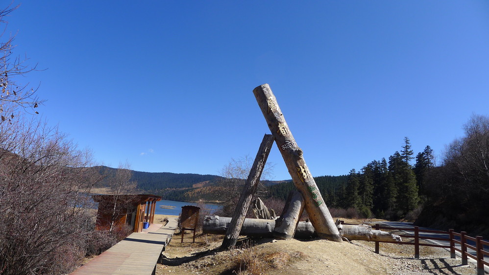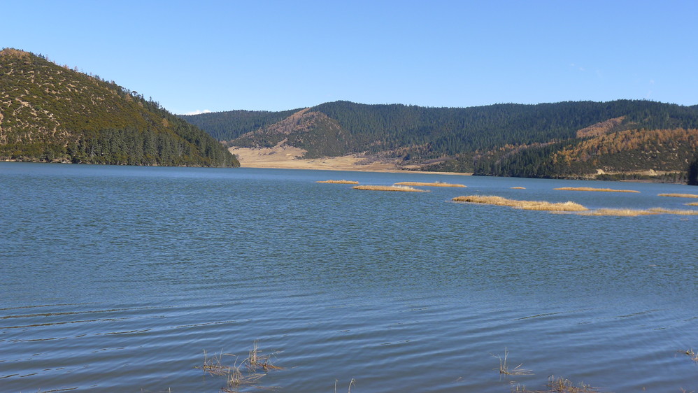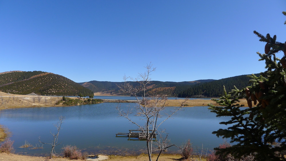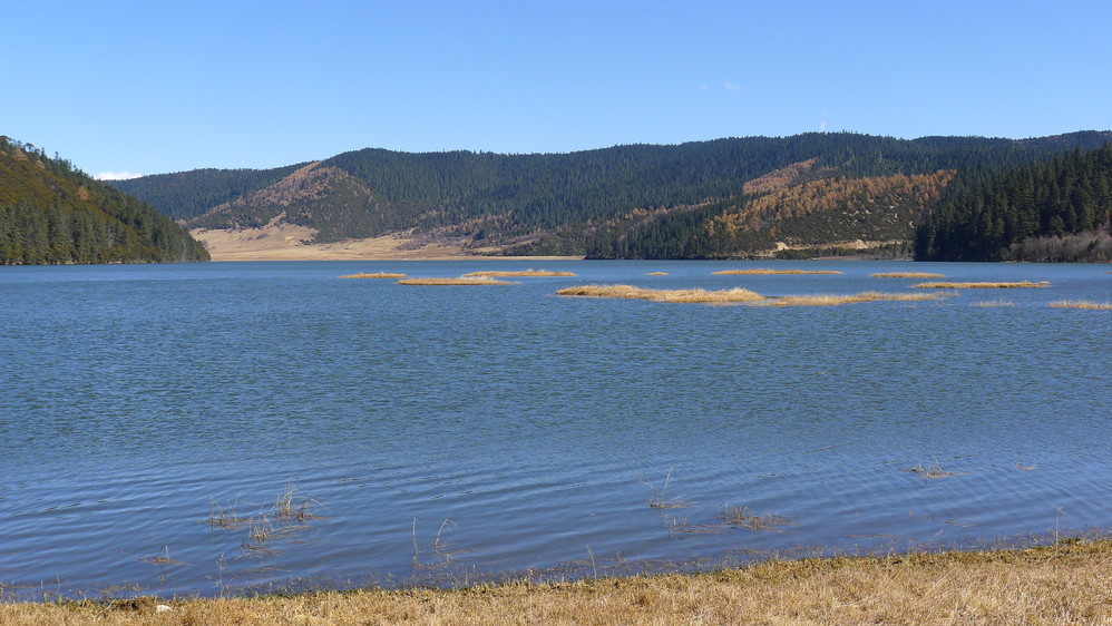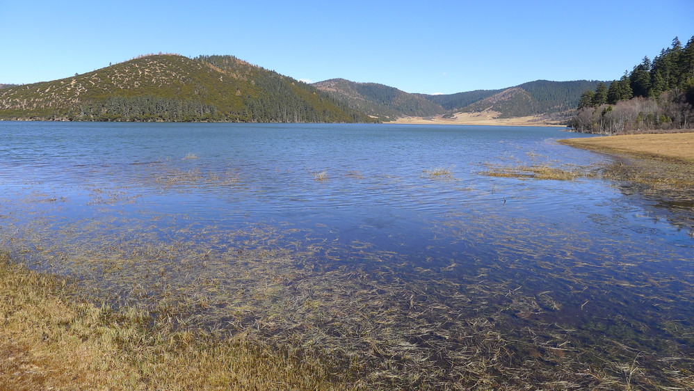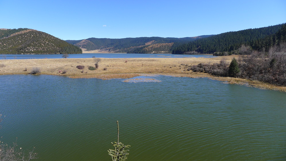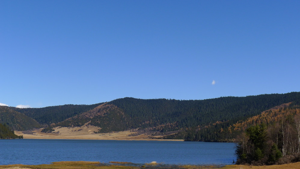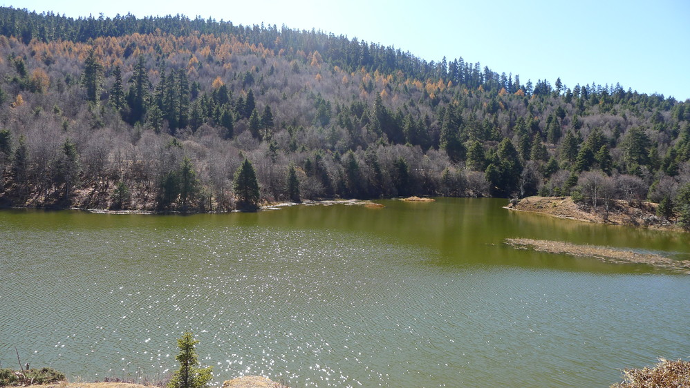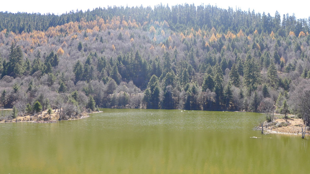 这个季节是普达措的淡季,景区巴士上也就8个人,看到路两边有光秃秃的空地,有自由吃草的牦牛,稍远一点就是长满松树的小山包。很快到了第一个景点---属都湖。