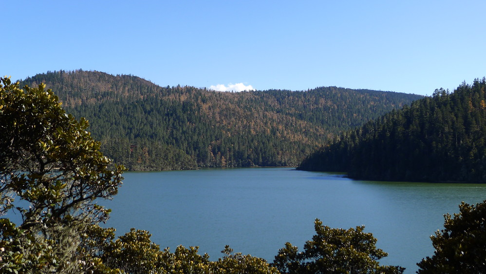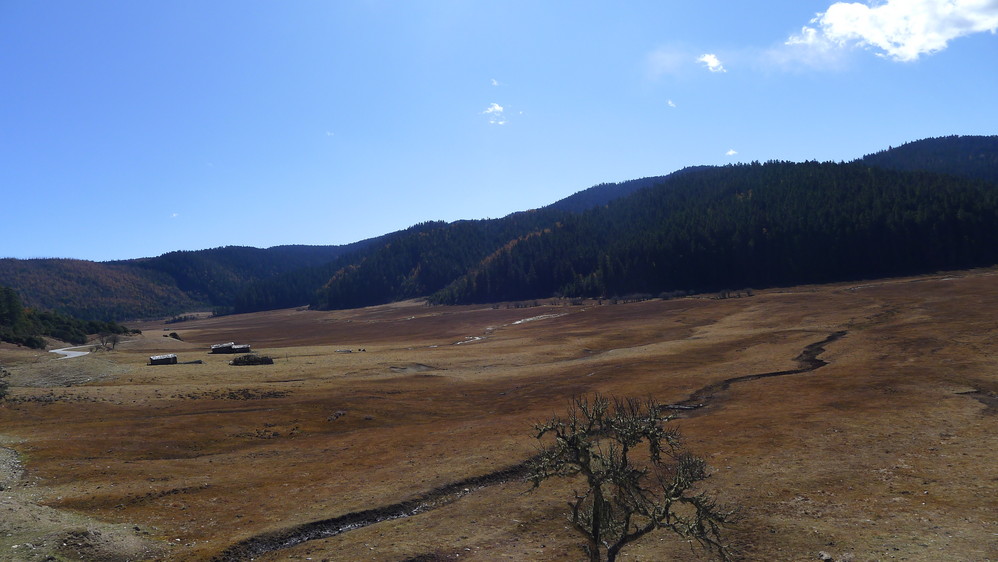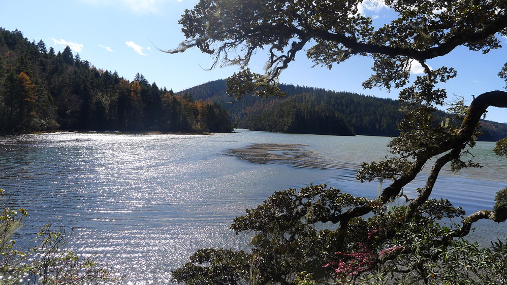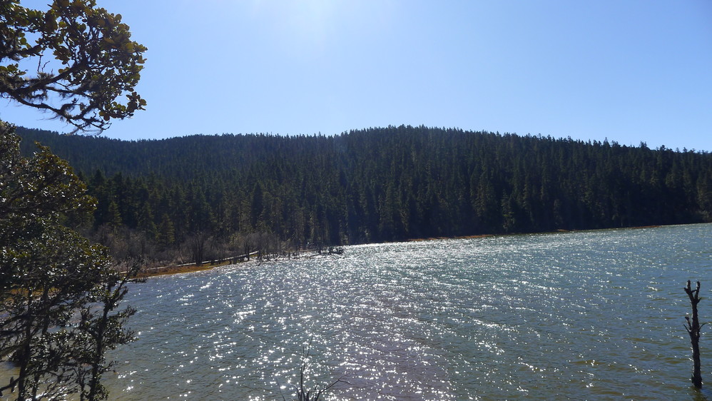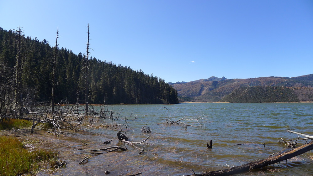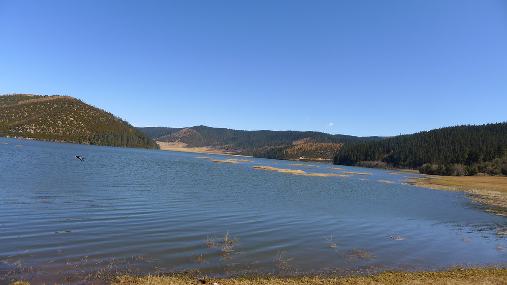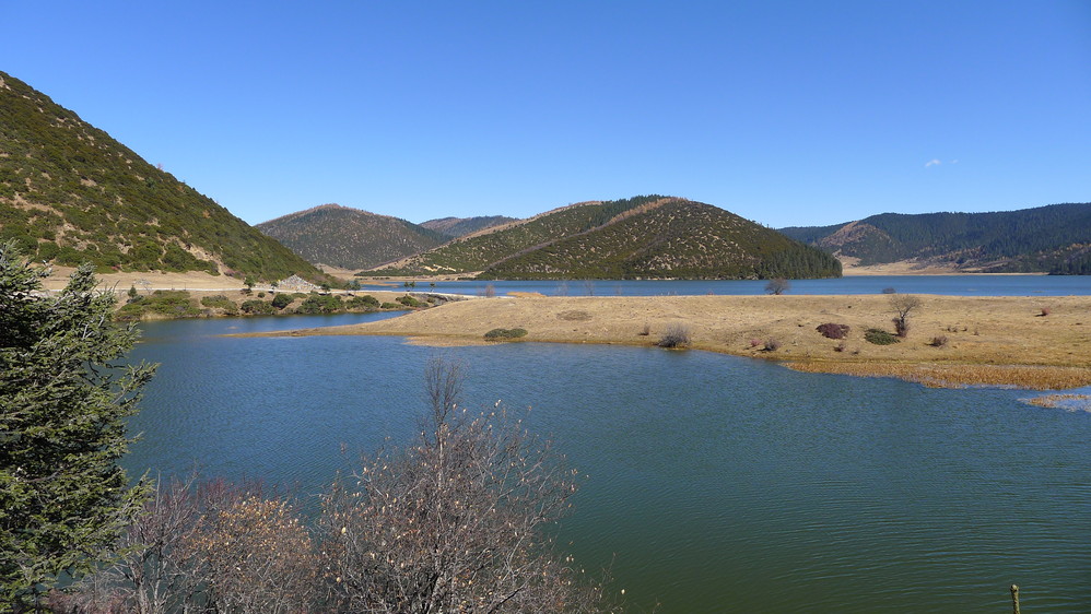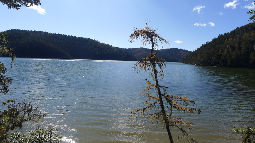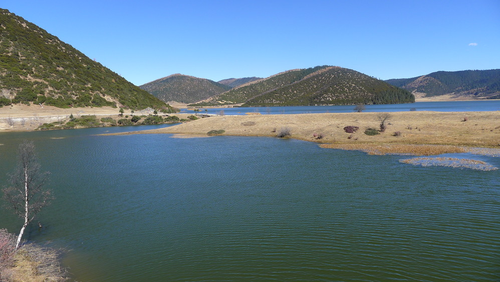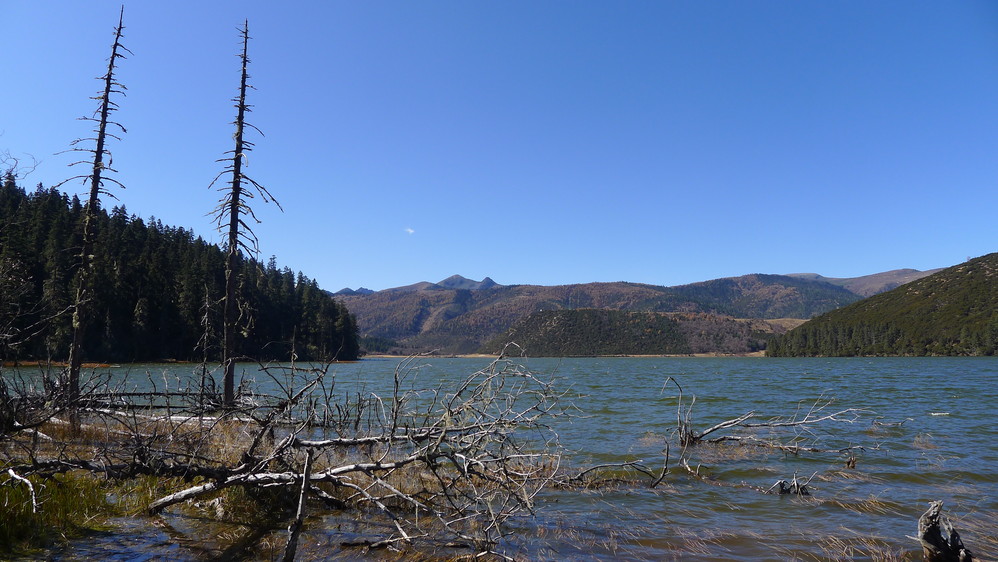 这个季节是普达措的淡季,景区巴士上也就8个人,看到路两边有光秃秃的空地,有自由吃草的牦牛,稍远一点就是长满松树的小山包。很快到了第一个景点---属都湖。