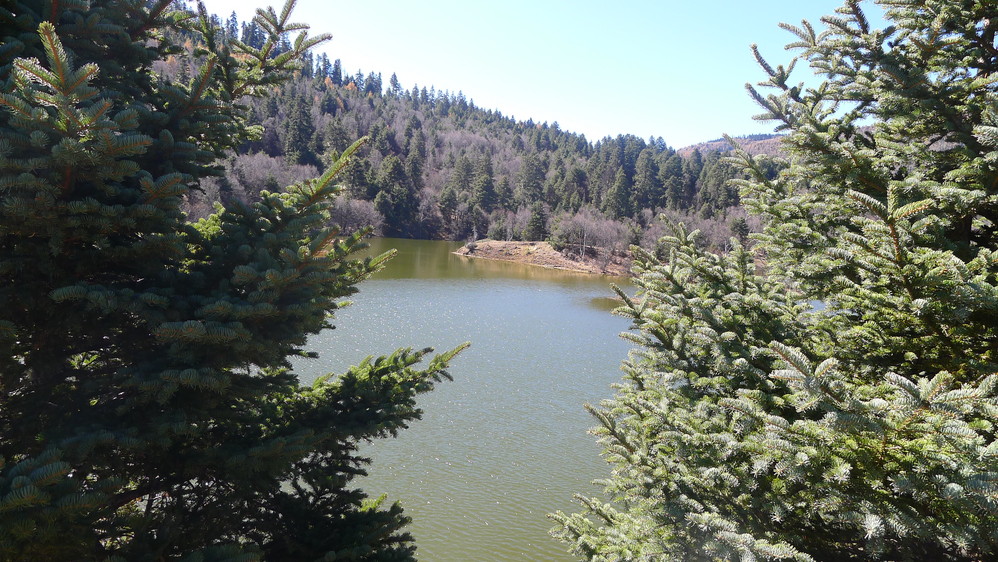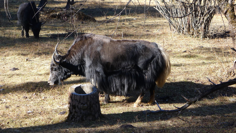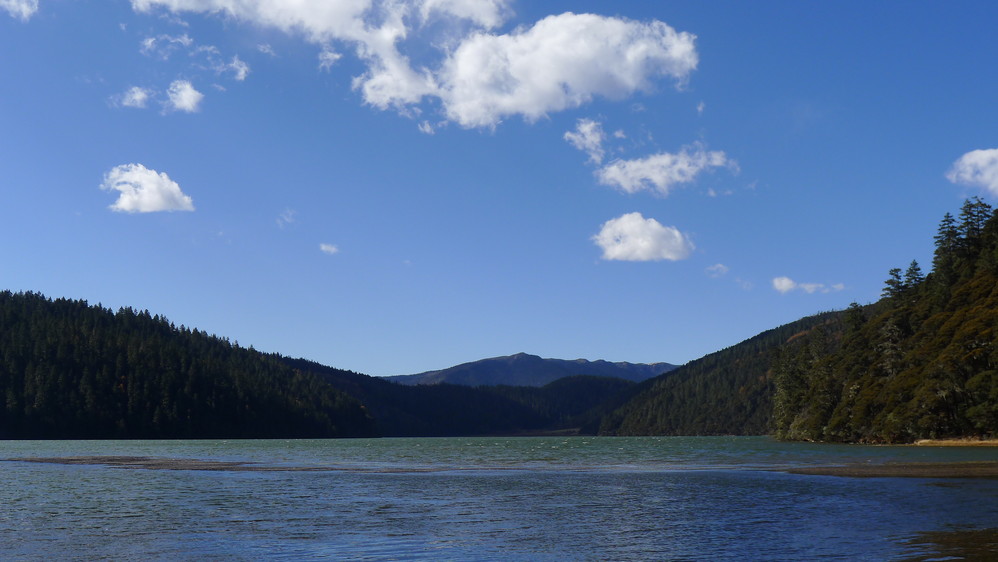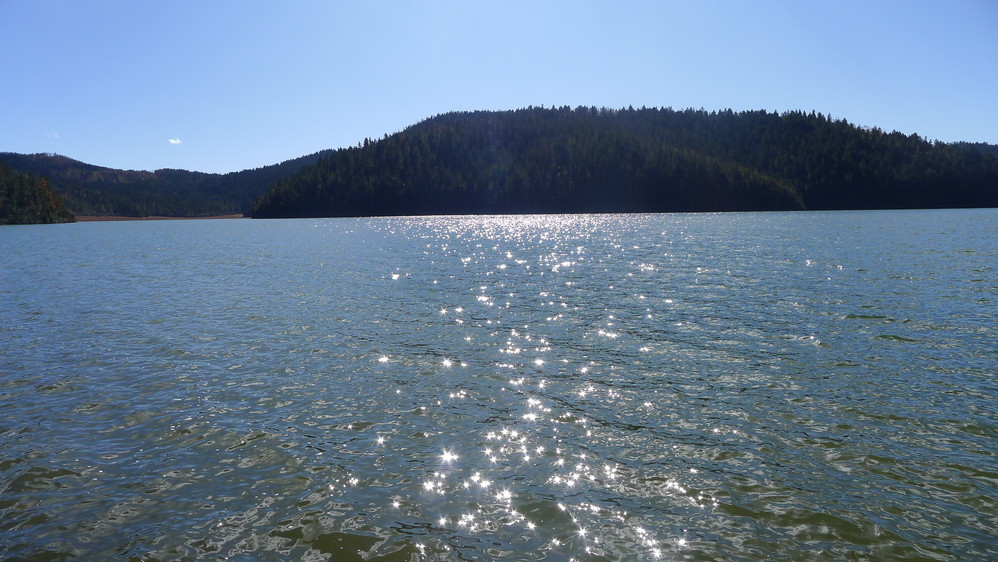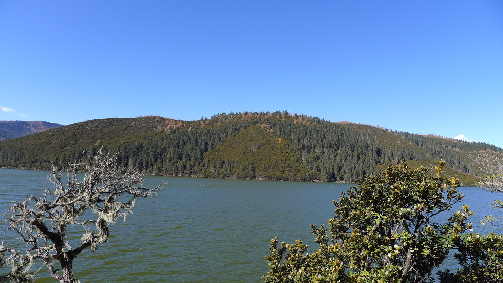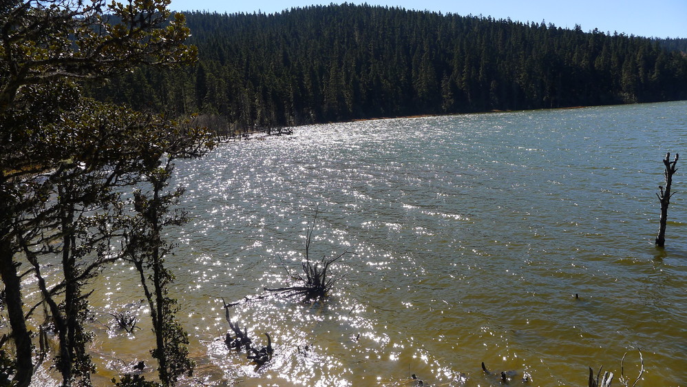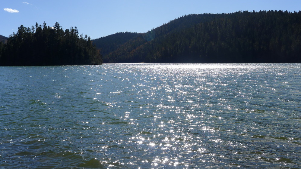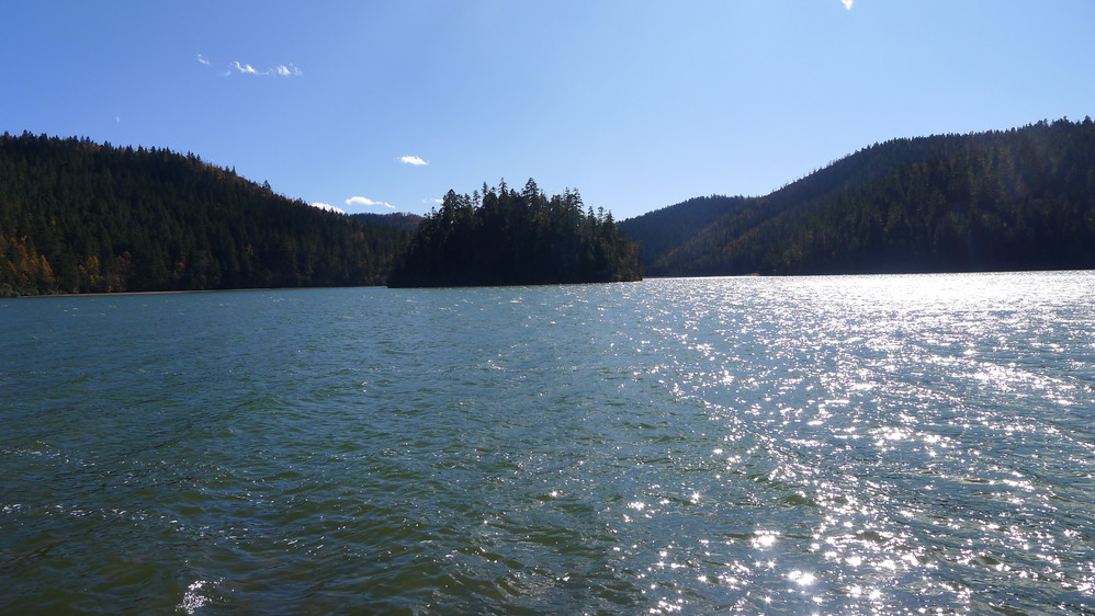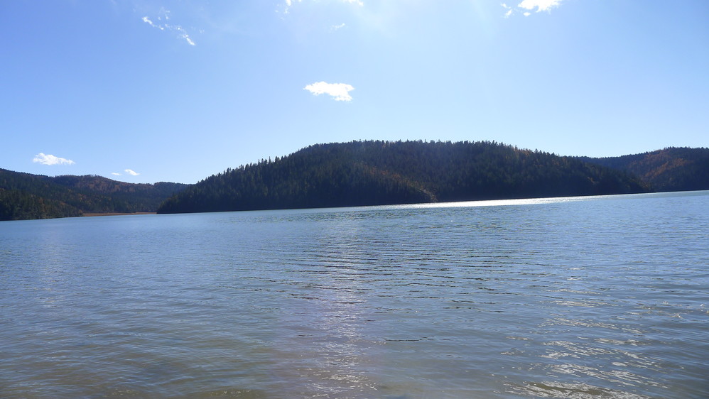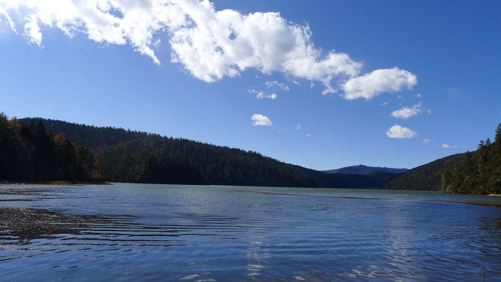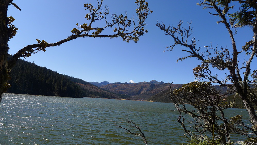这个季节是普达措的淡季,景区巴士上也就8个人,看到路两边有光秃秃的空地,有自由吃草的牦牛,稍远一点就是长满松树的小山包。很快到了第一个景点---属都湖。