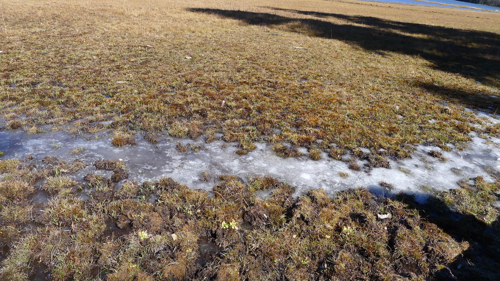 这里刚下过雪没多久,草地上还有冰雪的痕迹。
