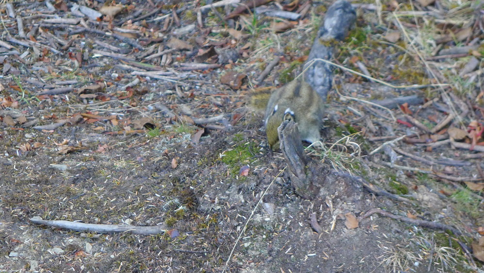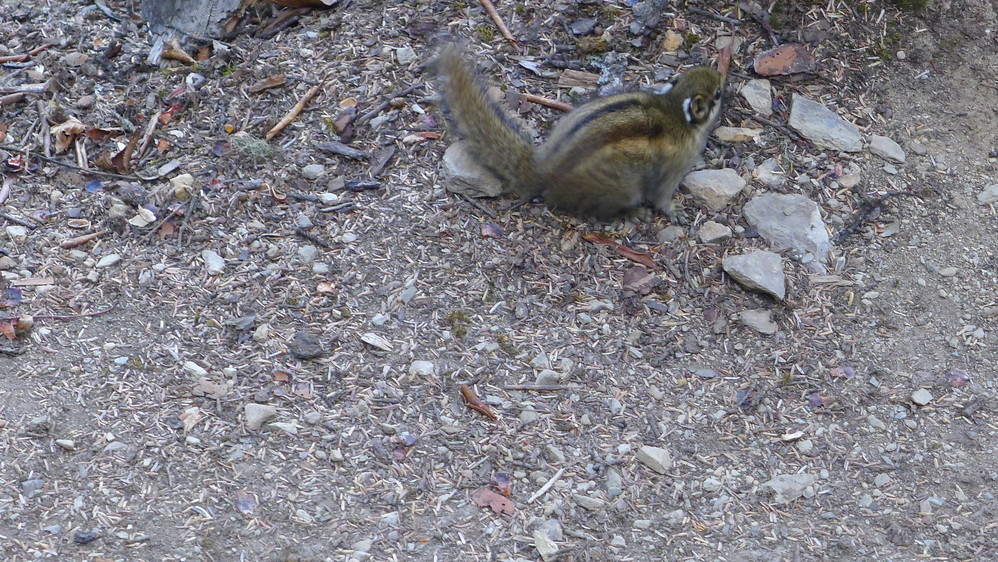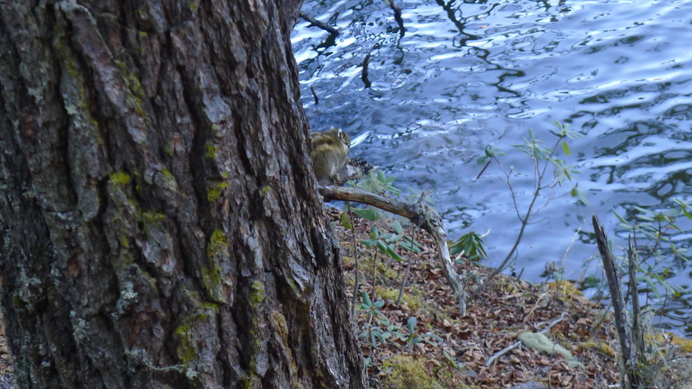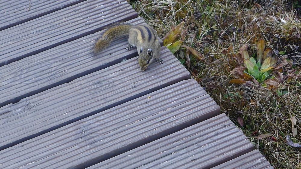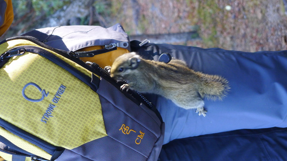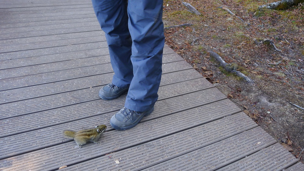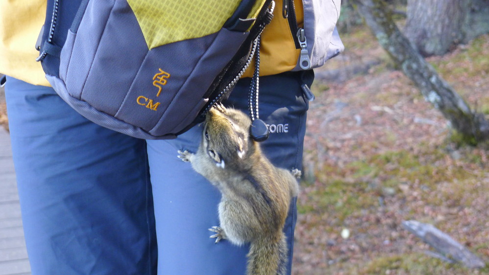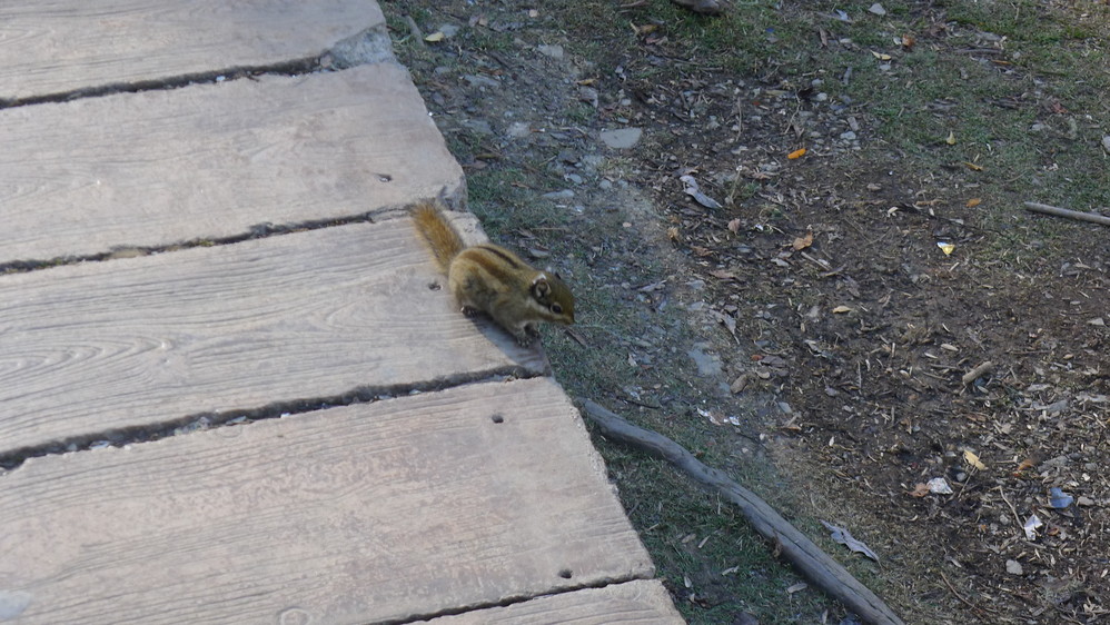 普达措的小松鼠们是不怕人的,有一只松鼠围着我们转,还有一只竟然爬到了布丁的身上,可爱吧!我们赶紧拿起相机一顿狂拍。