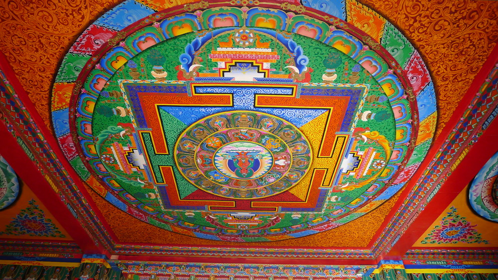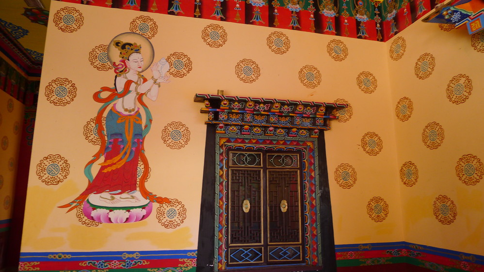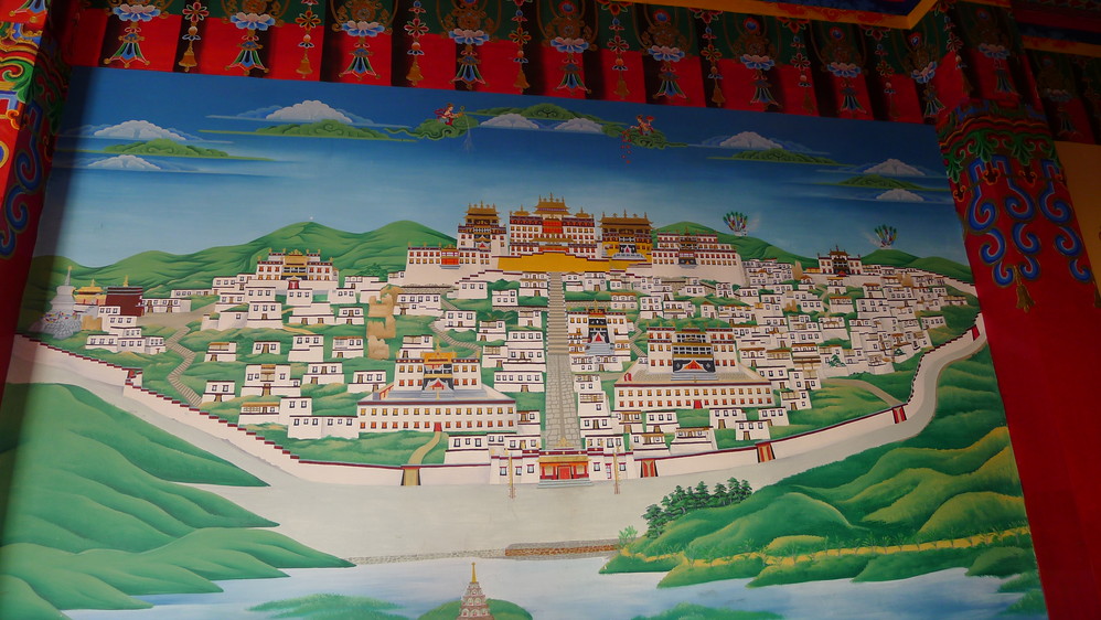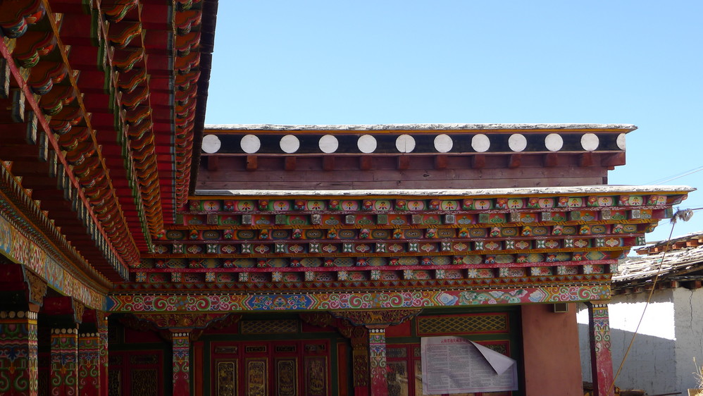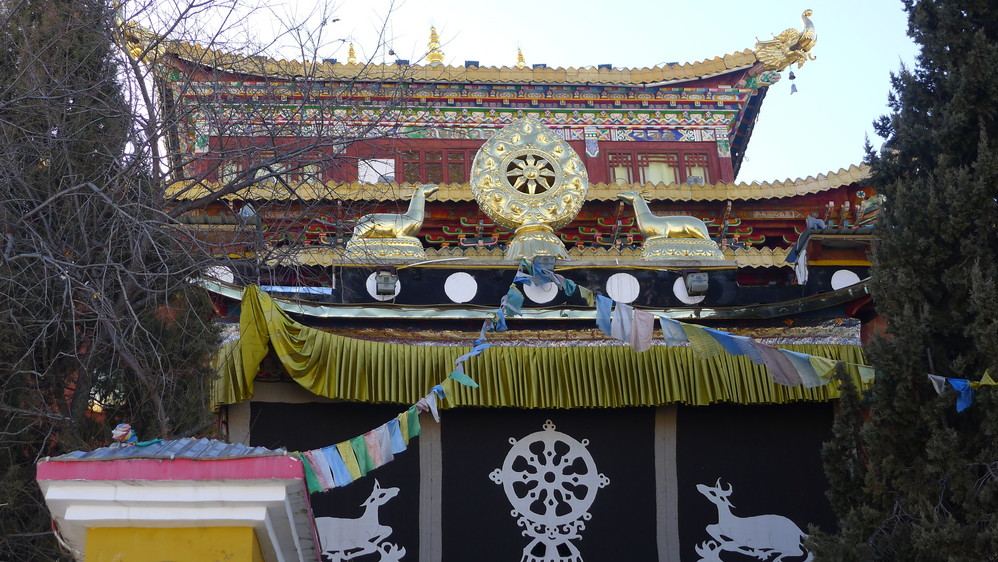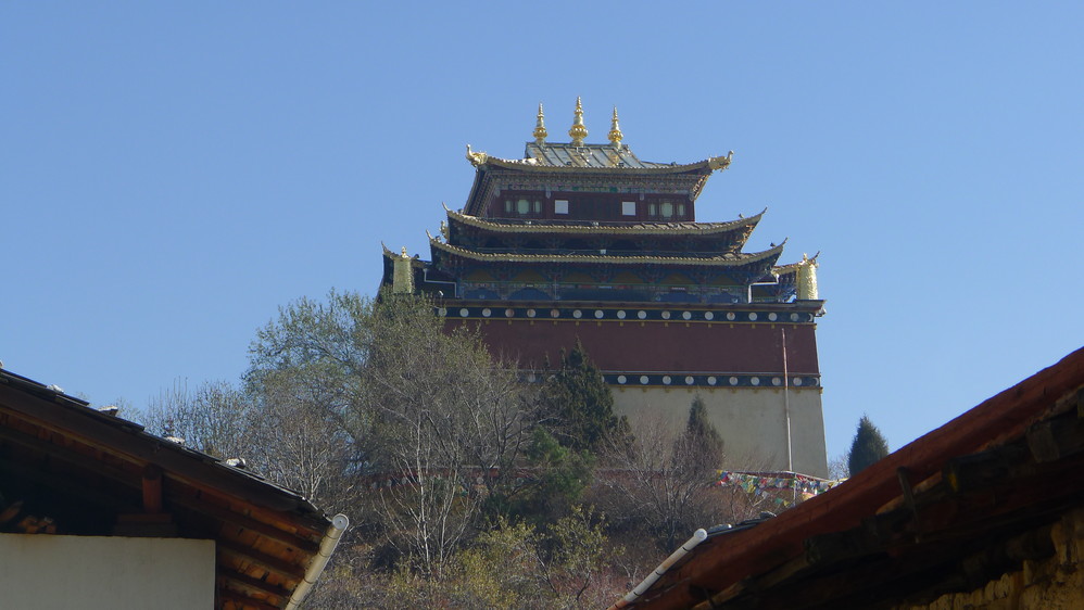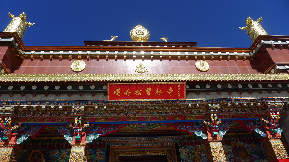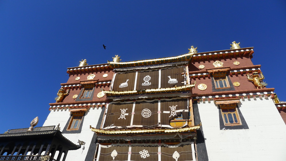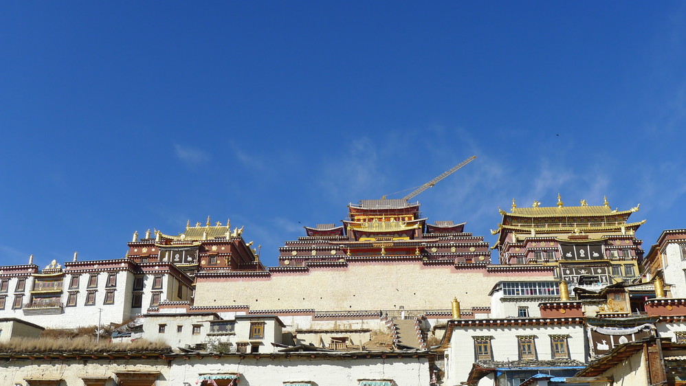 松赞林寺有三间大殿,有一间已经修了2年多了还没有修完。藏传佛教寺院给人金碧辉煌的感觉,很宏伟。刚开始以为大殿下面的那些房子是当地村民的,后来才知道这些都属于寺院, 里面居住的都是本寺的僧人,这个我们平时接触到的禅宗寺庙不同,藏传佛教寺庙的和尚主要由自己的家人供养,家人会为他在寺庙里面修建房子,提供给养,一般家庭条件越好,房子就越豪华,因为藏民认为自己家里能出一位僧人,功德要比修建一座白塔还要高。