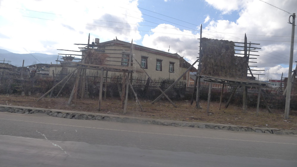 车子在山路上奔驰,进入香格里拉境内就进入了藏民区。藏民的房子和用来晾晒青稞的青稞架。