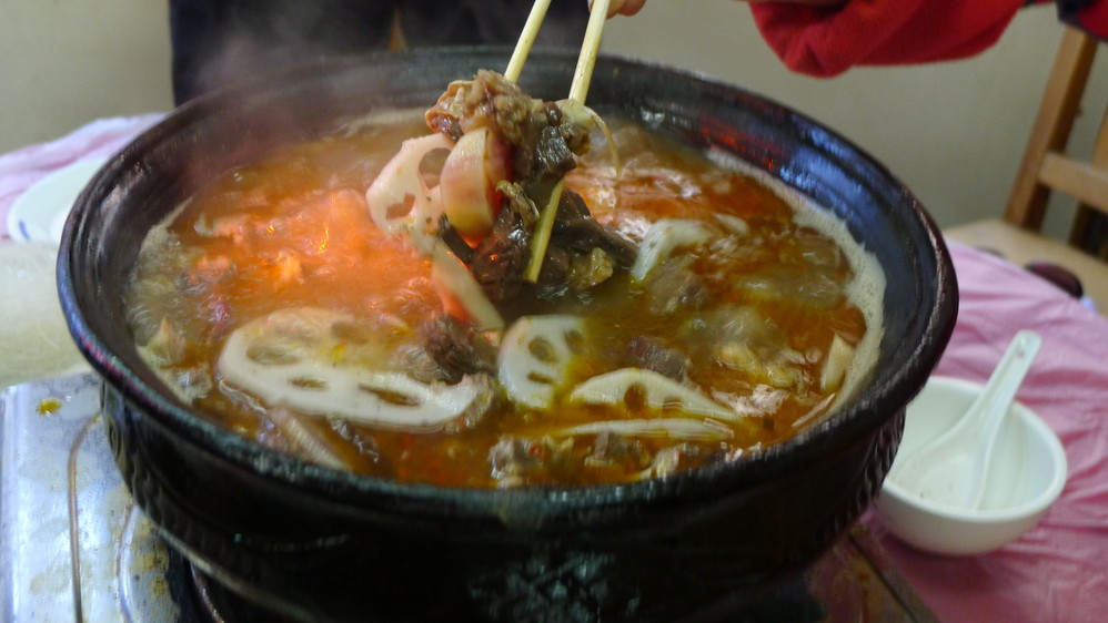 香格里拉本地的特色菜主要是牦牛火锅了,刚进城身上冷飕飕的,这里比丽江那边还要冷一些,吃上热乎乎的牦牛火锅也不错。两位大姐很快就在客栈旁边找了一家火锅店,排骨中午还吃了点东西,其他人都是饿了一整天了,马上开动起来。