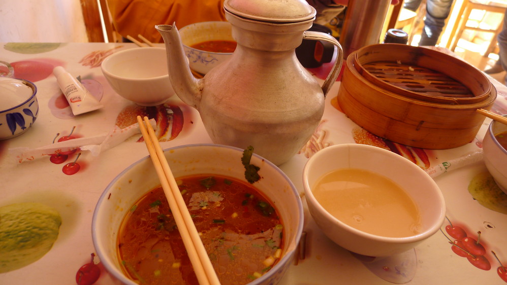 第二天,我和排骨换了一家客栈,布丁没有动。今天打算去普达措,先吃早餐。我们的早餐是包子,饵丝外加一壶酥油茶。第一次喝酥油茶,味道我还可以接受,在高原多喝一点酥油茶可以预防高原反应,补充能量,藏民每天都早餐基本都要喝的。