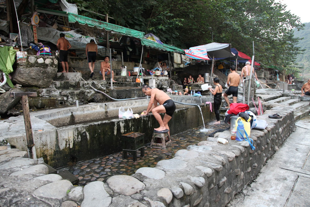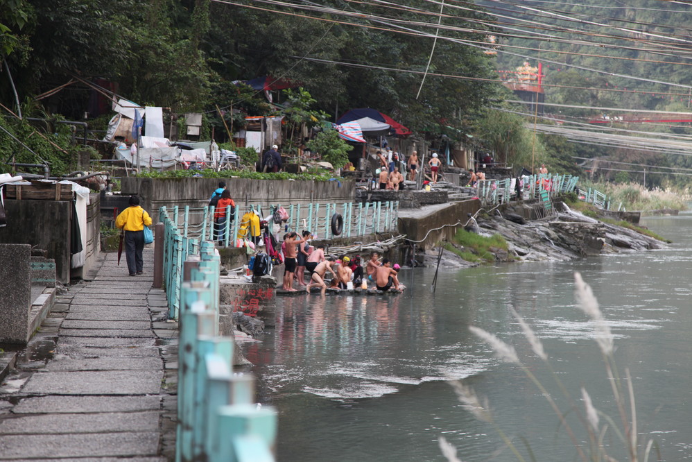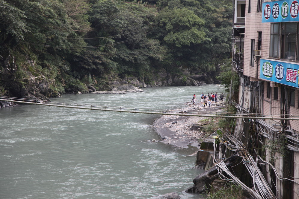 走在橋上, 往右邊看, 就可看到水邊有不少人在泡溫泉, 這是由山麓的石縫中流出來的.烏來溫泉源頭分為兩部份,一部份由山麓的石縫中流出,另一部份則是從溪邊亂石灘中冒湧而出,因泉位低故須用馬達抽到高處,再用水管輸送到街上的旅社,因此一條條的輸送水管橫越溪谷成為烏來溫泉旅社的特殊景觀,聽說今年開始要整治這些溫泉水管了.