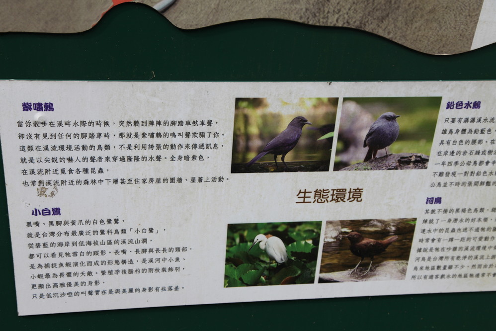 鳥類以留鳥、冬候鳥和過境鳥三者為最常見,還有那台灣地區特有種的台灣紫嘯鶇、台灣藍鵲等。