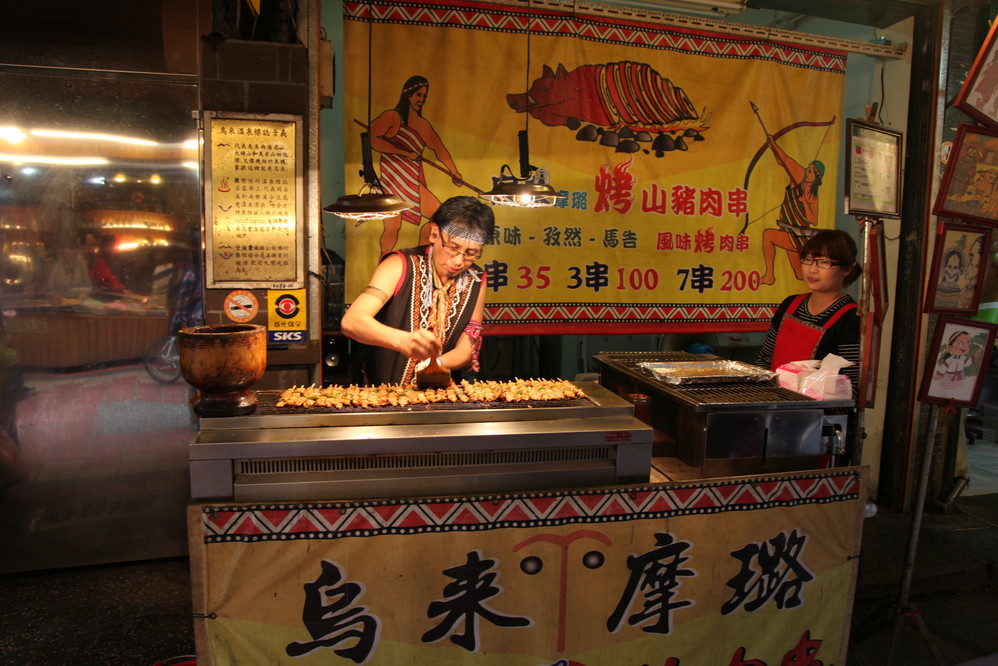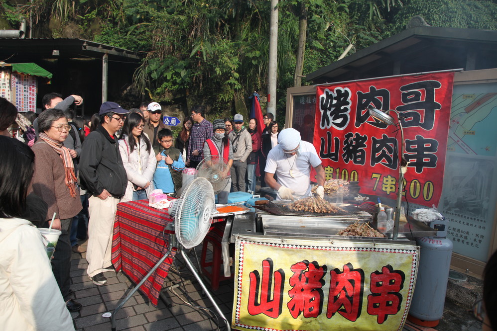 烤肉哥的山豬肉串, 總有一堆遊客圍觀其特殊的烤肉方式.