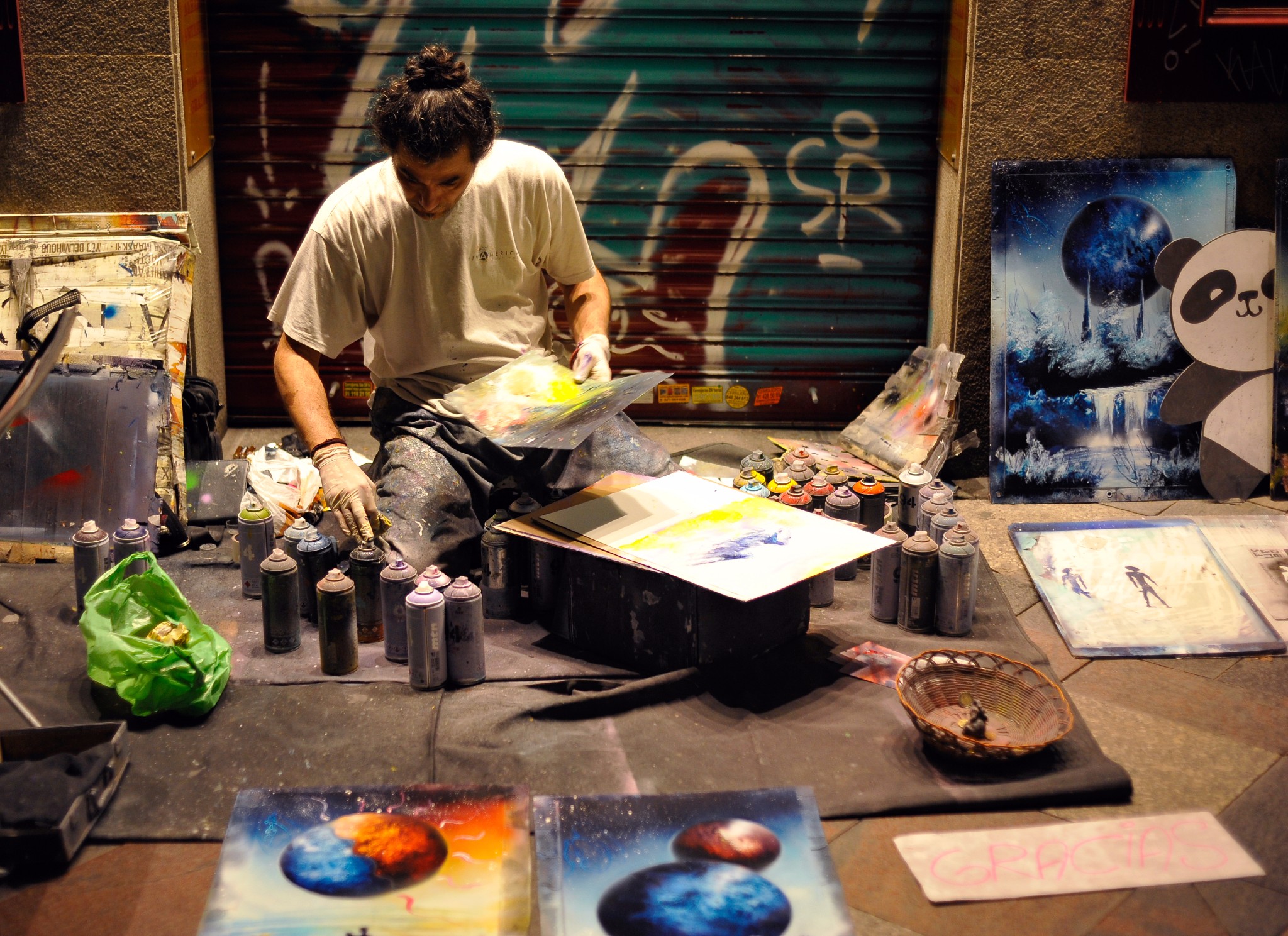 街头艺术家。作品表达了男女融合创造生命时的梦幻景象。面前的几个年轻女孩看得入迷,叽叽喳喳地讨论了一阵以后,派了一个代表去要下了这个艺术家的INS号。