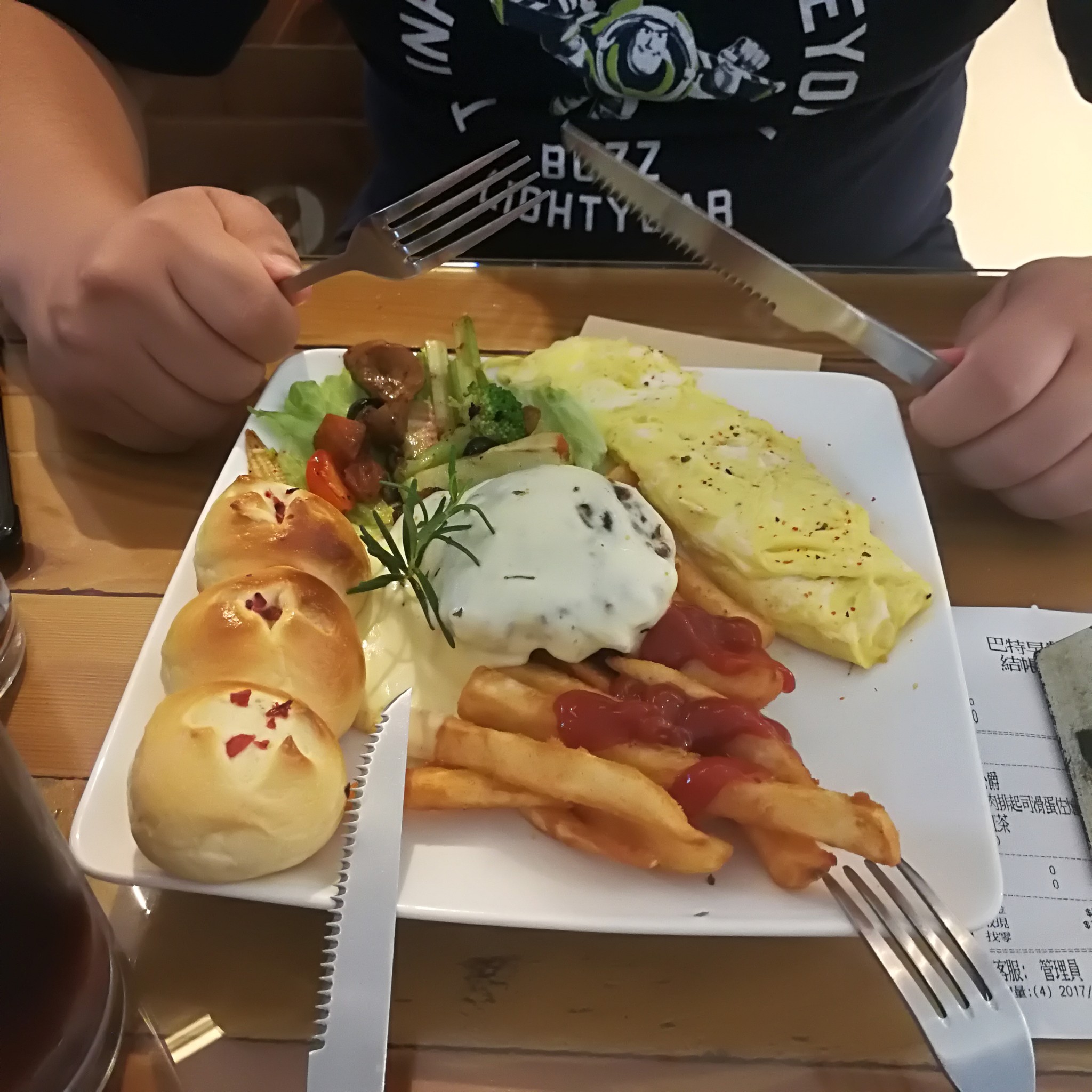 大圆同学搜到附近一家小餐馆,Butter 巴特2店 Brunch&cafe,绕着这个地块我赚了一圈半才在一条不大的小巷子里找到这家店。店面不大,确是非常火爆。有点“蒸汽时代”的陈设,却依然台式小清新的氛围,这算是我们来台正儿八经的第一餐吧。