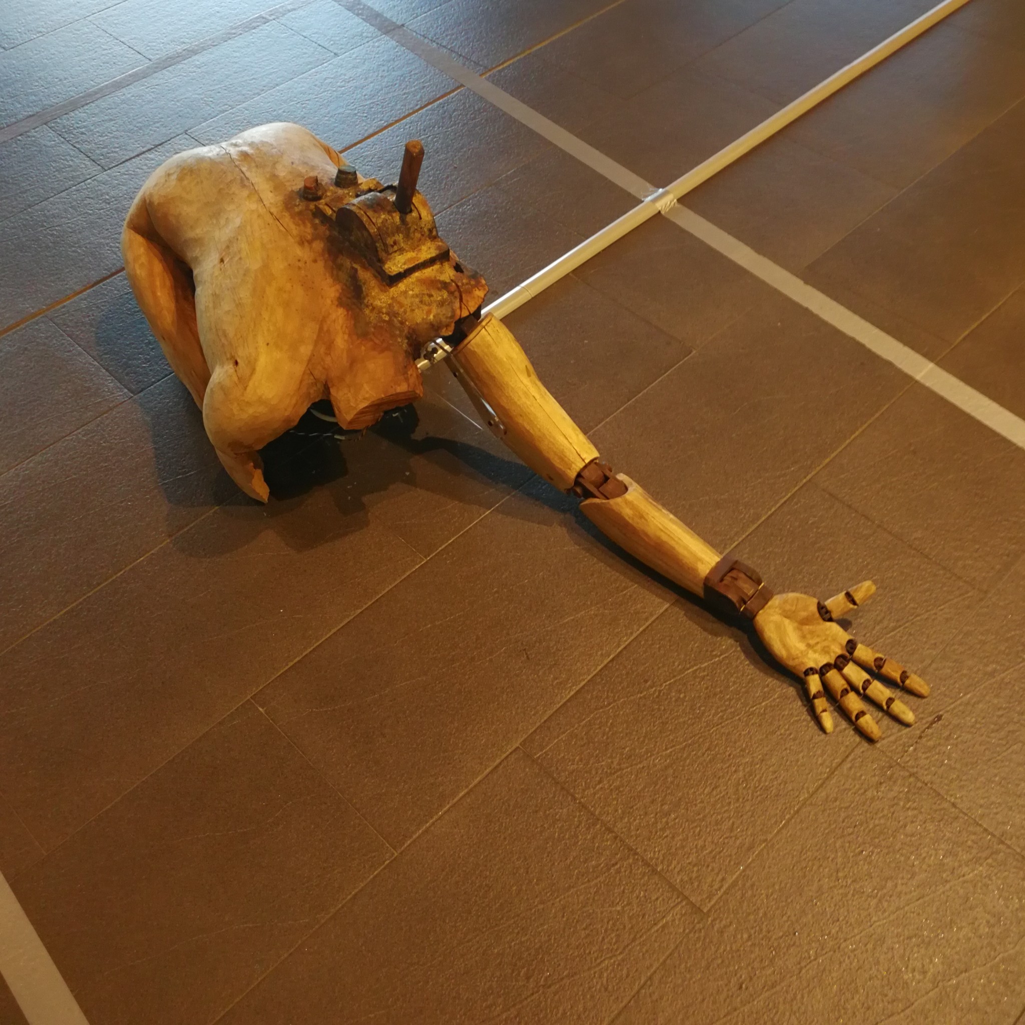 这个稍有些骇人的作品,就这么平放在地上,周边没有任何保护,只有一圈警示的胶带,我注意到,无论大人小孩没有一个试图踏入圈内触碰展品的,这不得不说,是一种素质。试想一下在国内,会是一番怎样的情景?