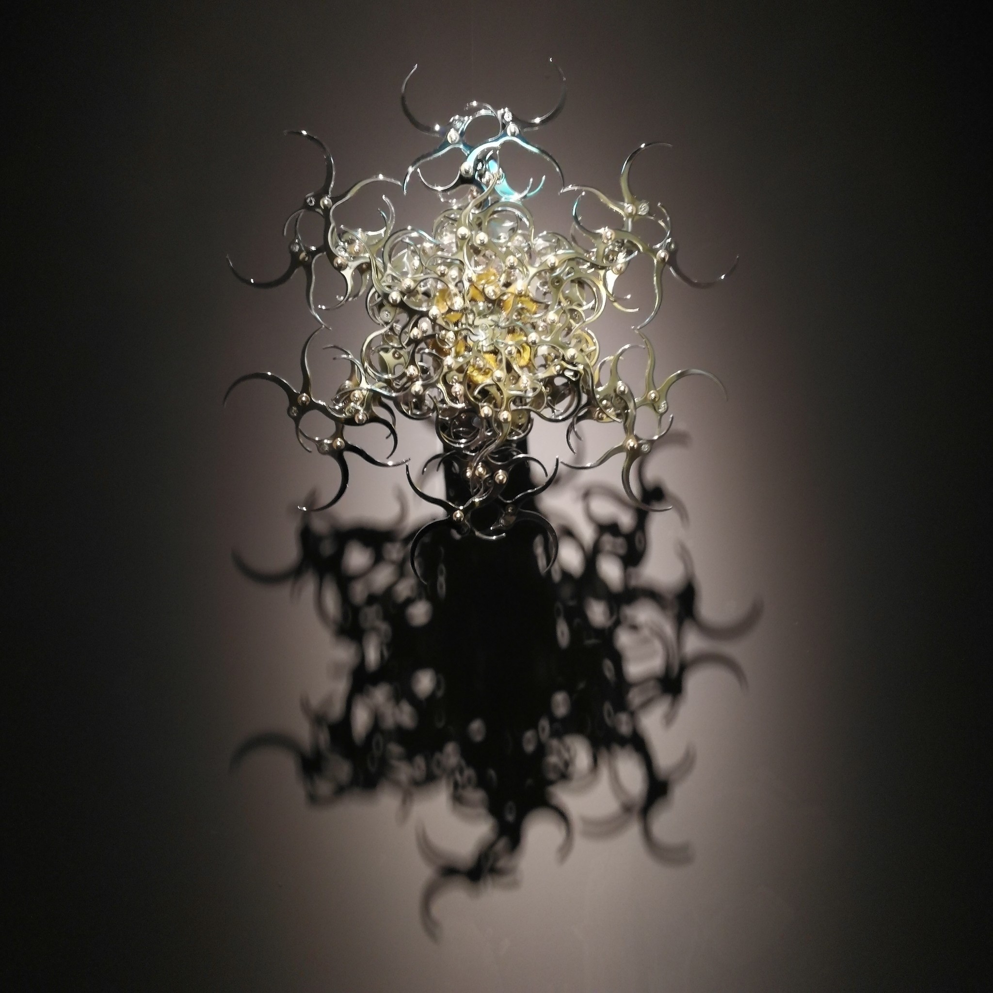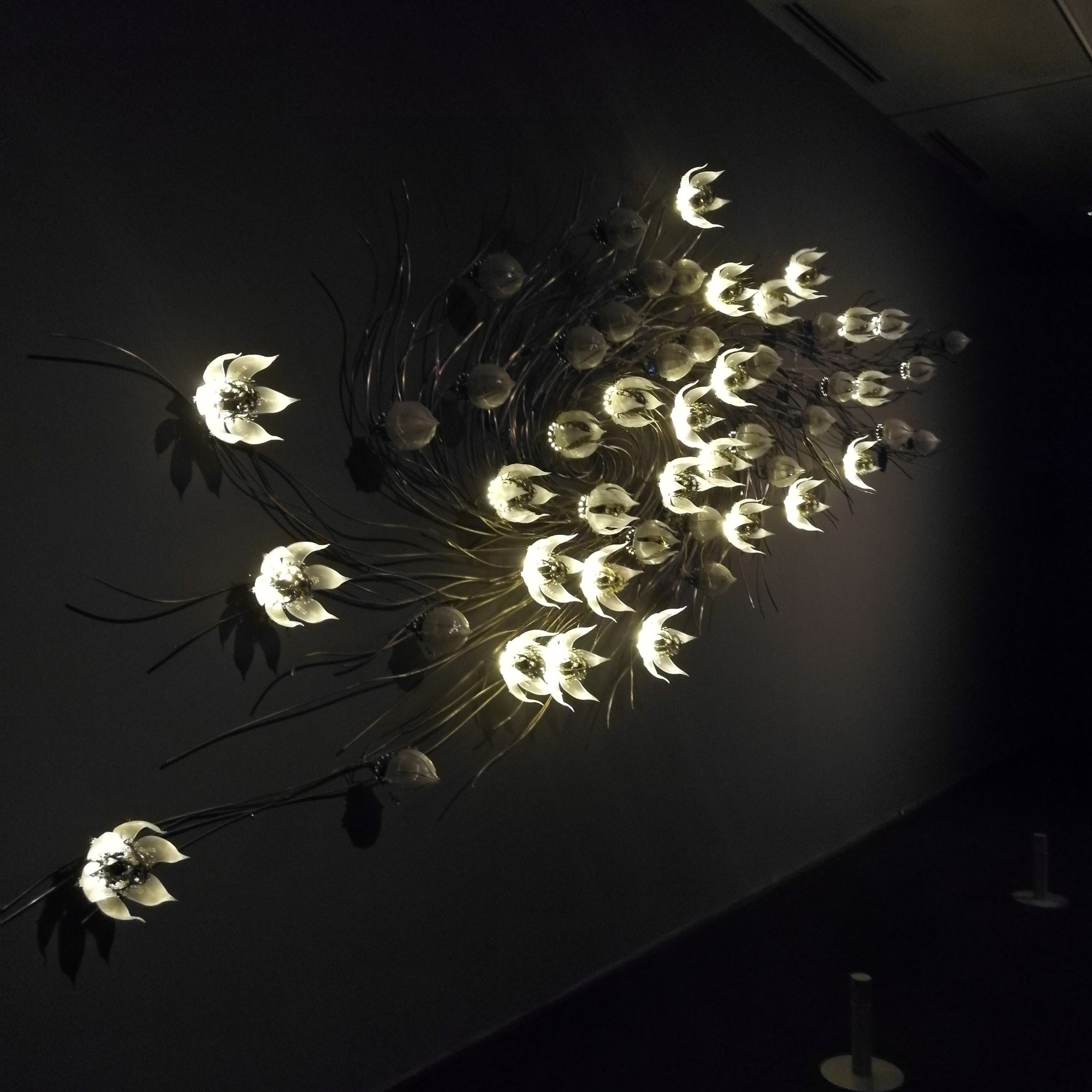 很美的作品,花瓣随灯光的亮起暗灭而开合,全部是由齿轮传动的。作品对面一条长凳上的观者,都忍不住驻足,仿佛会被她的魔力催眠一般。