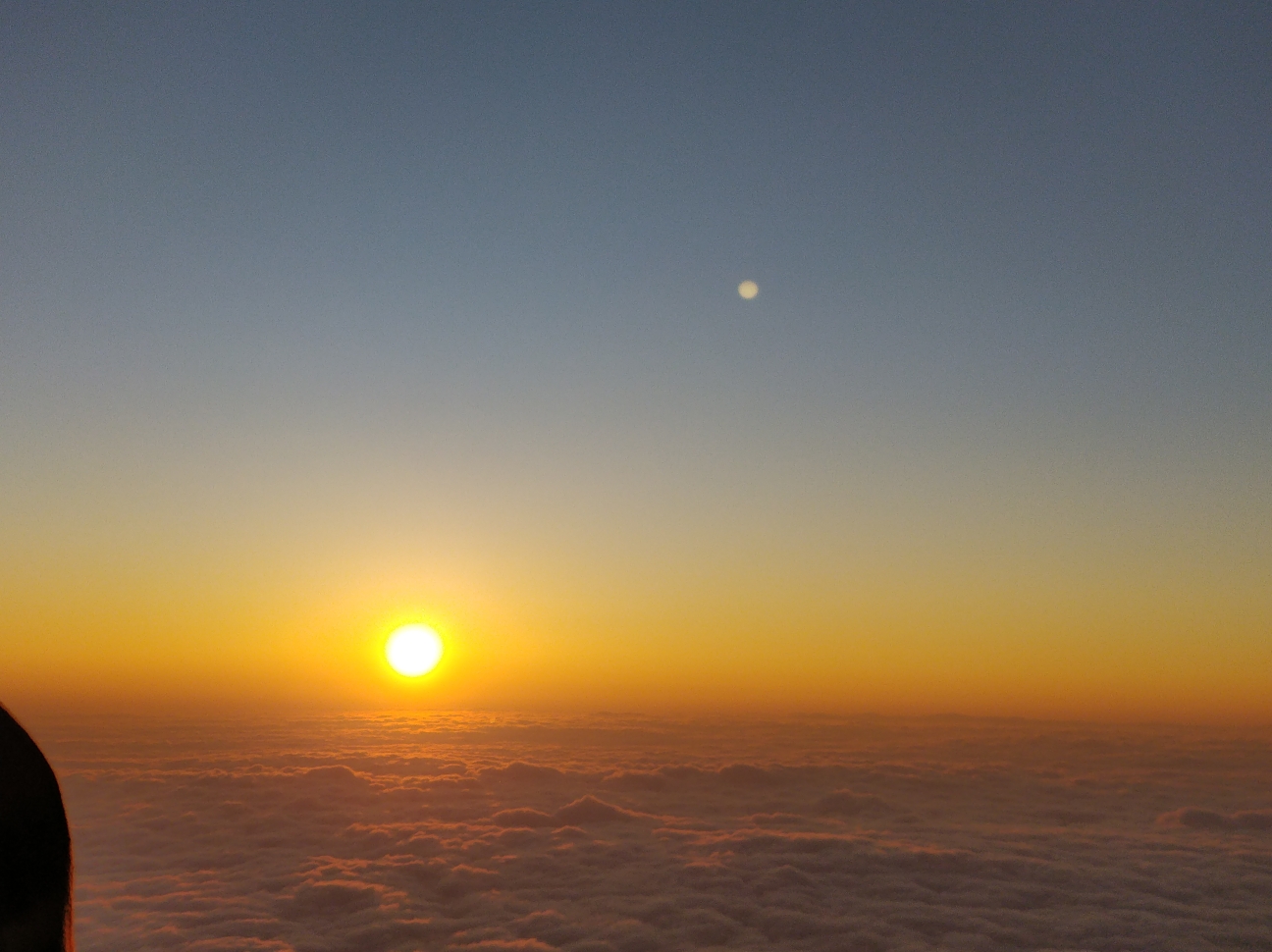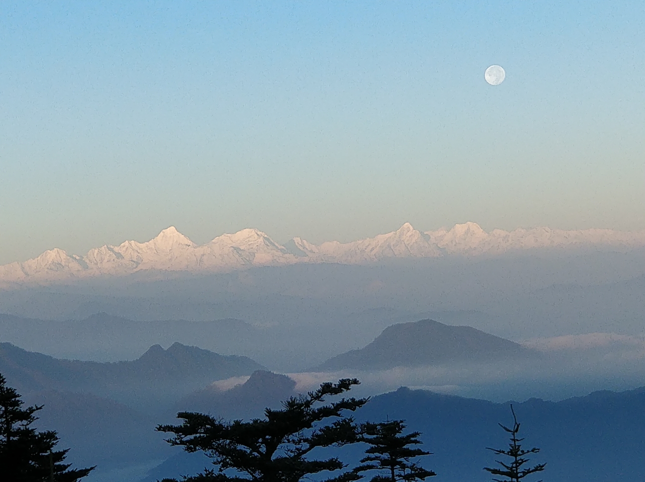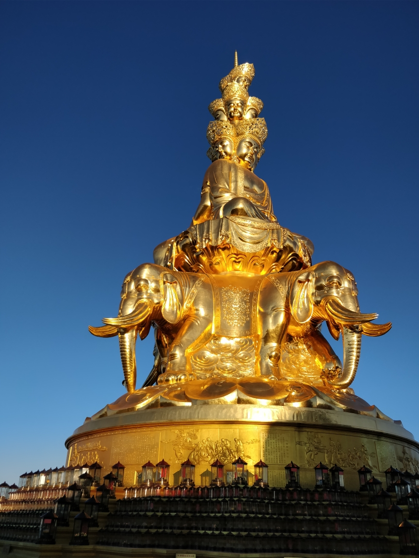 从缆车下来,山顶的风景真的太美了,刚刚跃出云层的朝阳把云海染成了金黄,远处一片霞光,云海的波澜壮阔让人叹为观止,第一次看到如此壮观的云海,感觉如入仙境。太阳慢慢升起来,云海由朦胧的金黄慢慢变得清晰,远看是浩瀚飘渺的云海,近看是一团团的云卷云舒。转到山的另一边,马丁指向远方,噢噢,在攻略上看到说在天气特别好的时候能看到远方的贡嘎雪山,此刻就在眼前,而且还有月亮挂在雪山上空,太美了。日出,云海,雪山都是要在天气很好的时候才能同时看到,运气太好了。峨眉山一年有大半的时间都处在云雾中,能碰上这么好的天气实属难得,不枉我跋涉了十多个小时的崎岖山路,不虚此行。金顶的十方普贤圣像新贴了一层金箔,在阳光照耀下金光闪闪,以从未有过的虔诚跪拜了普贤菩萨,然后和马丁一起沿着山路往下而去。