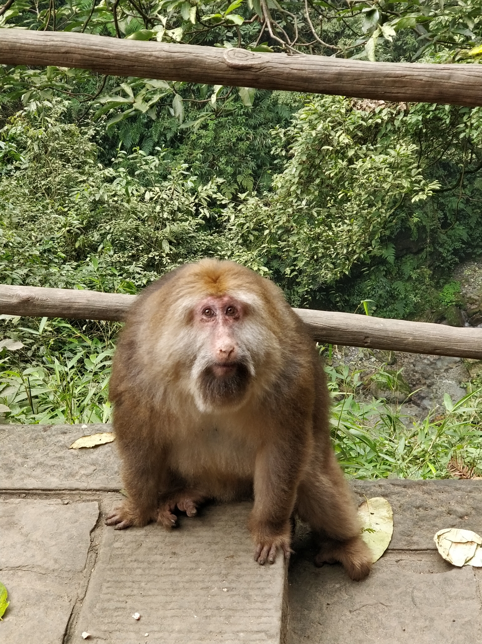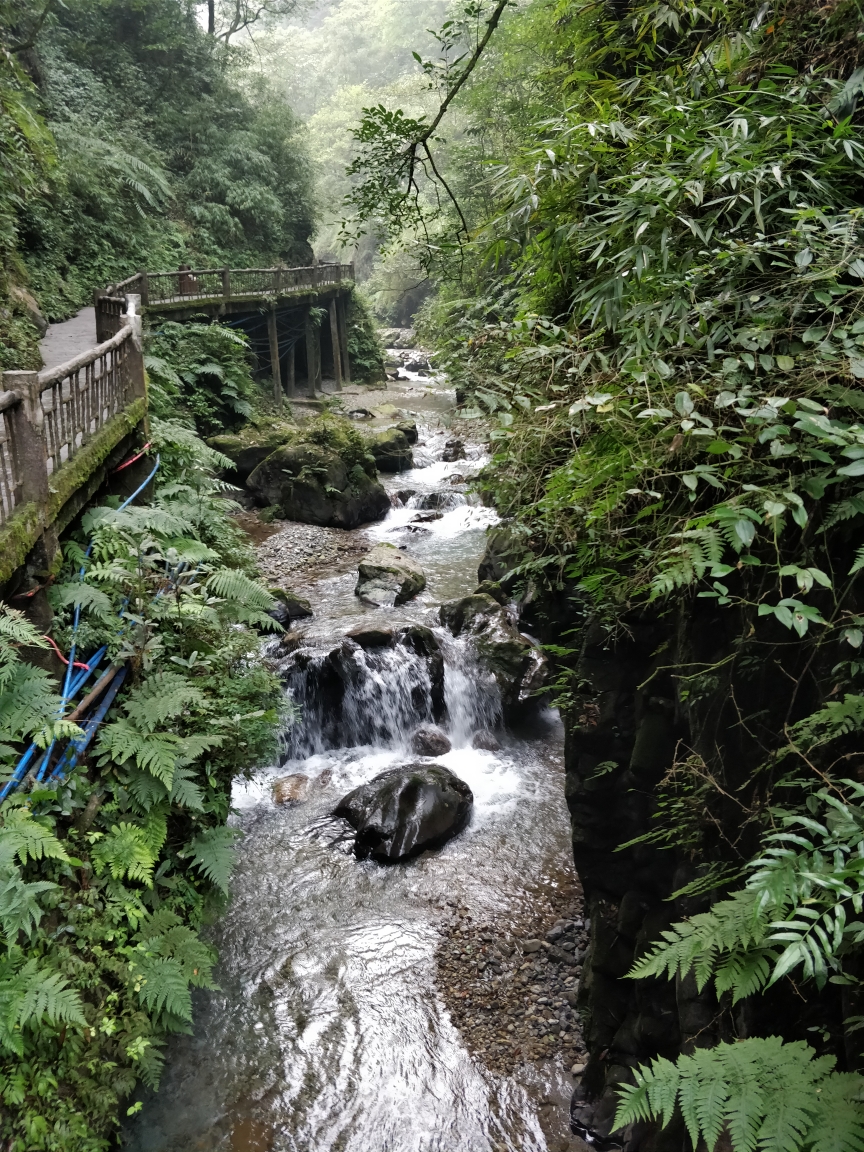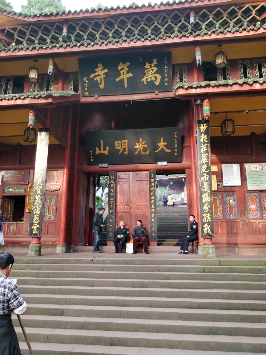 我选择从万年寺出发,在山下旅舍一大早起来坐车到万年寺入口,八点整开始登山。万年寺是峨眉山香火最旺的寺庙,历史悠久,参拜者众多,也是山上唯一要另售门票的寺庙。从万年寺参拜出来,感觉神清气爽,身轻如燕,背上的背包感觉没那么重了,看来拜佛还是有好处的。万年寺到清音阁这一段一路都是下坡,是整段路程最轻松的一段。到了清音阁,忽觉人声鼎沸,这里的风景很不错,很多人选择在这里住宿,确实有道理。清音阁沿着溪流一路往上走就到了猴区,这一路的风景应该是半山最美的一段。猴区遇到几只猕猴,个头都很大,不敢招惹,拍过几张照片之后匆匆穿过。因为很多人都是看完猕猴就返回下山,所以过了猴区之后人就非常少了。