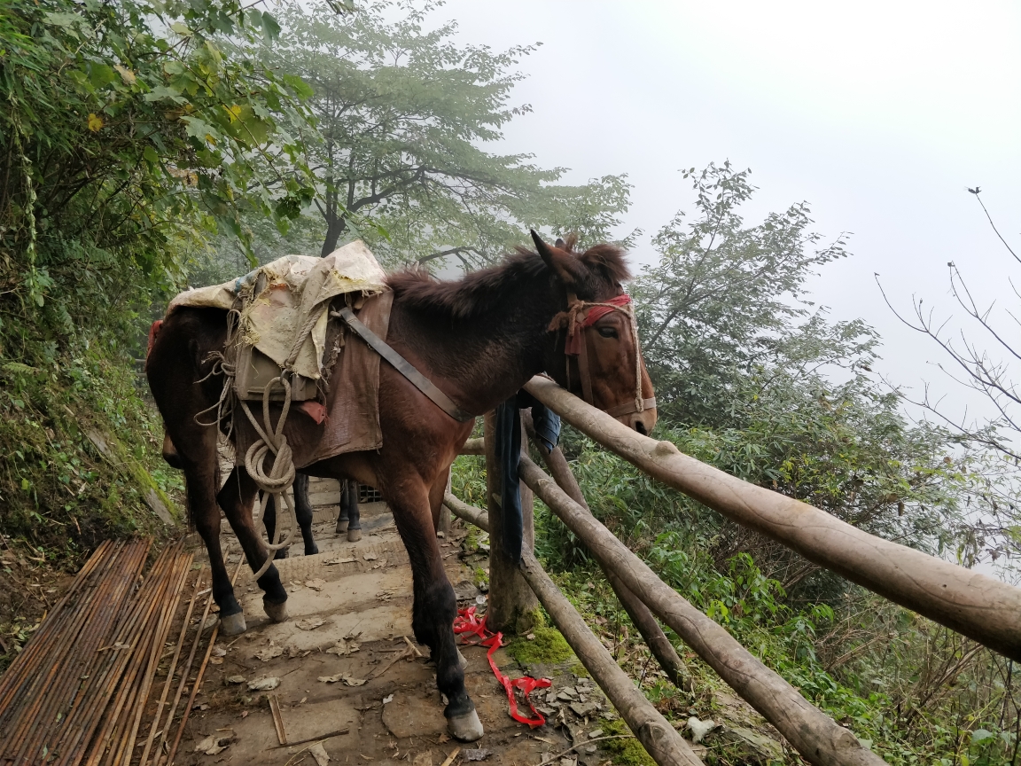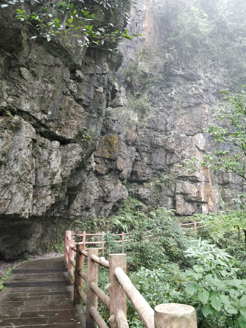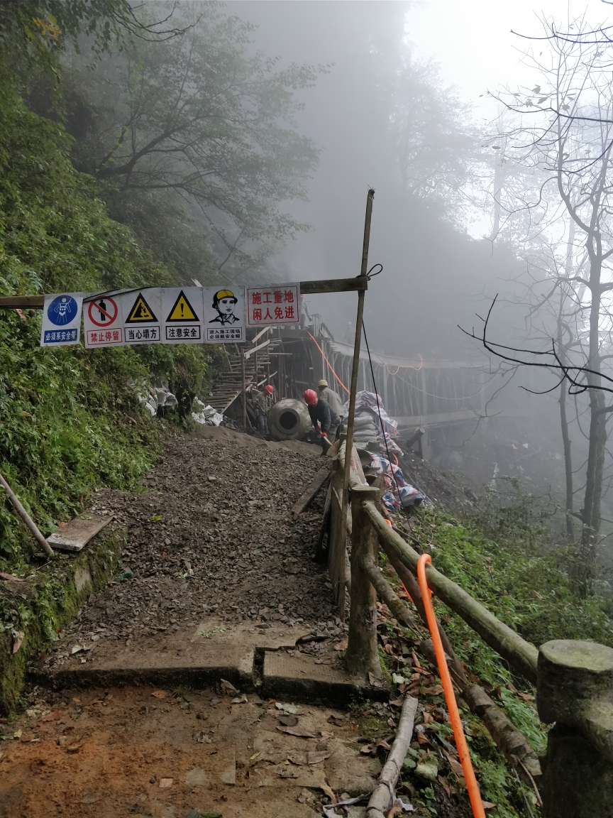 到了洪椿坪遇到一位境外帅哥正坐那休息,于是上前搭话,他是澳大利亚人,看起来很年轻也很腼腆,应该是大学生,休息了一会儿之后邀请他一起同行,走了十多分钟之后境外帅哥就把我远远的甩在身后,他个子高体力好走得快,我背着一个沉重的大包渐渐的追不上他。这时路上已经看不到人了,而且这段路是整条登山路上最难爬的九十九道拐,这时我的腿开始抽筋了,风景依旧很美,内心却开始绝望,总算在一个休息点碰到北京来的一对情侣,聊过之后得知他们头天已经上山了,在山上住了一晚,而且今天还要在仙峰寺住一晚,明天才会到雷洞坪,把一天的行程分成三天来完成,我想不单是体力的原因,更多的是他们把这个携手攀登的过程当成一种享受,爱情不仅限于都市的咖啡馆,在寂静的山道携手前行更是一种别样的体验,最重要的不是风景,而是一起看风景的人,我想这次旅行会成为他们人生美好的回忆。为了不打搅他们,吃了点干粮之后我先上路了。到达仙峰寺之后一路都是下坡,然后听到一阵机器轰鸣声,原来这里塌方已经封路两个多月,现在正在工程施工,怪不得这条路人这么少,很多人就是因为知道塌方封路所以选择了万年寺右边那条路上山,先前看攻略说那条路风景没这么好但路程更短一些,正所谓无知者无畏,一路走来欣赏到了更美的风景也体会到了非同一般的艰辛,关键是塌方处已经可以通过,幸哉幸哉。