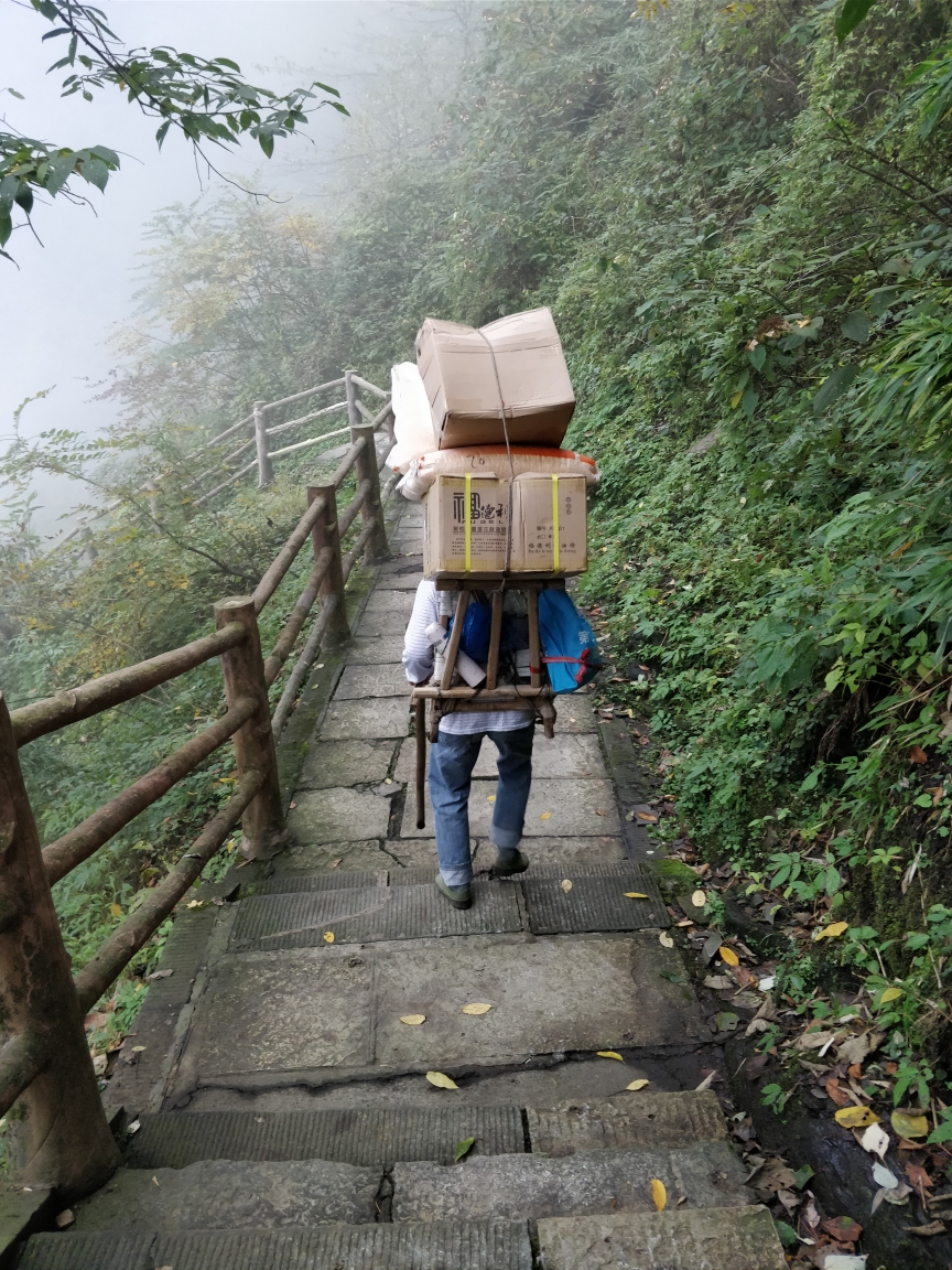 到达洗象池时已是下午五点,这里是两条上山路会合之后的第一个休息地,人也多了起来。在这里我遇到了马丁,他来自德国,他问我准备去往哪里,他的目的地是雷洞坪,正好我也是,于是搭伴一起走。在上山之前我并不确定自己在天黑之前能爬到哪,因为不确定因素太多,所以并没有提前订住宿的酒店。到达雷洞坪时已经七点,刚好天黑,于是我们一家家去找酒店,很多酒店都客满了,只有一家还剩一个房间而且还是公共卫浴,要价350,网上提前订的话只要一百多,没办法,马丁说想和我一起分担房费我们共住一间,这也是我想要的,三百多太贵了,而且正好是二人间,第一次和老外同住一室,这体验可真奇妙。马丁告诉我他在德国学针灸,来成都参加为期两个星期的学习交流。他在德国有一家公司,学针灸只是他的业余爱好,他希望在几年之后能成为一名中医医生。我真没想到中医在德国居然这么受欢迎,而且马丁在德国还学过中文,中文能讲一点点,特别是数字的中文他表达得非常清楚。