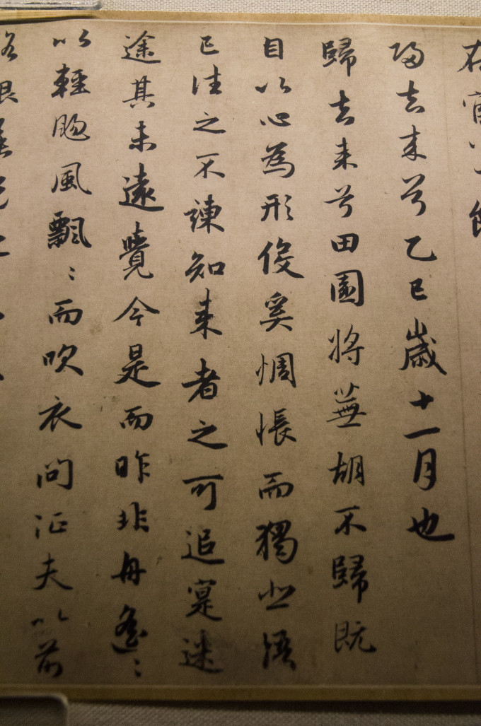 右,赵孟頫四十四岁所书归去来辞,真迹一卷,松雪中年,字多寓方于圆,仪态洒然,奇处尤在锋芒转折,无毫发渗漏,于安详整饬中见运斤成风之妙,非有笔冢墨池之勤,而复精神饱满用志不分者,不能到也。
