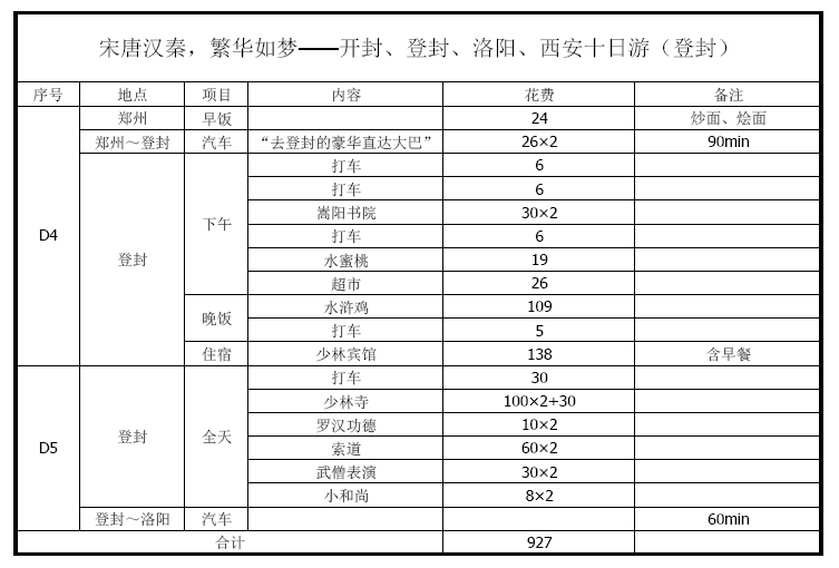 先上花费表,在少林寺花的钱最多。