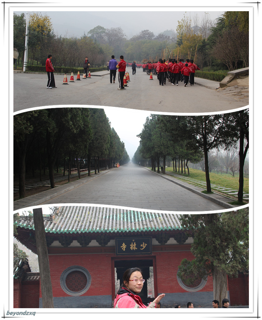 到少林寺打车基本上是统一价30元,对了,得表扬一下登封的出租车,好像是有统一的出租车呼叫电台,随时播报各种需要打车的信息,双方得益。每辆车都是招手即停,没有因为你去的地方近就拒载,这点很好,尤其是到了洛阳,更为怀念!登封武校超多,去少林寺的路上,路两边可谓是武校林立,每家都冠名少林武校,但是好像每家跟少林寺都没有什么直接关系,其中规模最大的可能就是塔沟武校吧,也是在少林寺景区唯一还有校区的一个。进了少林寺景区首先看到的也是塔沟武校的孩子们去上课的情形,景区刚刚扩建,距离寺门据说走路需要20分钟,乘车需10元,我们把钱用来请导游了且时间充裕,就沿着大道走起来了,不一会儿就到了寺门。