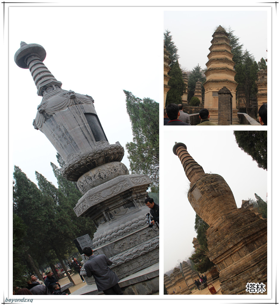 少林寺的又一景点——塔林,塔就是去世的和尚的幕。左边比较新的那座塔为七级,就是塔身刻有笔记本,飞机都有的那个。塔的层数是有规定的最高七级,且都为单数,根据墓主人生前功德决定层数。不知道评价的标准是不是统一的,前几天看玄奘之路,看玄奘的塔才为五级,不明白呀不明白。