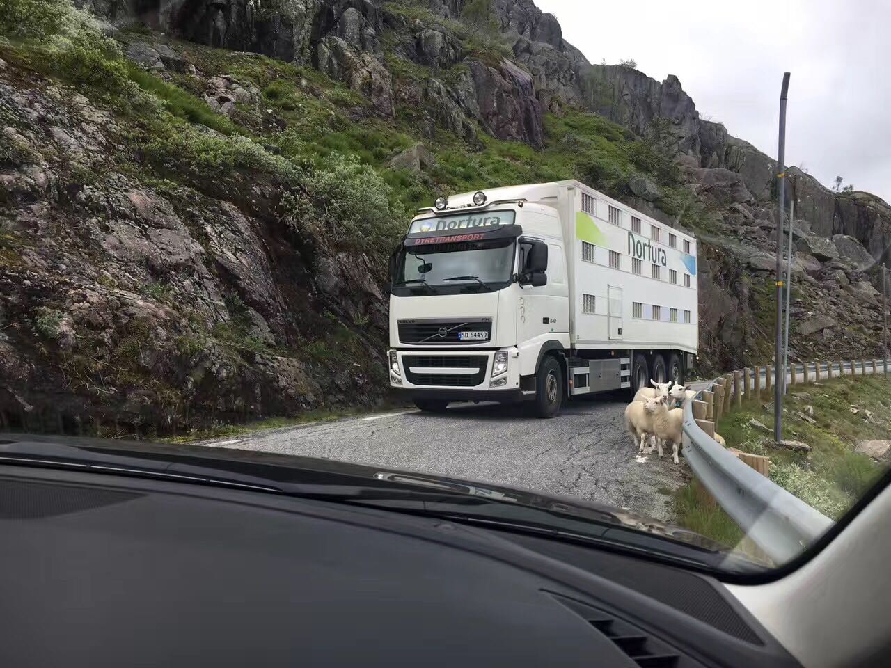 和大货车会车的山路(这种会车挪威的峡湾地区很常见),这张是在哈当厄尔高原,结果山羊还来凑热闹: