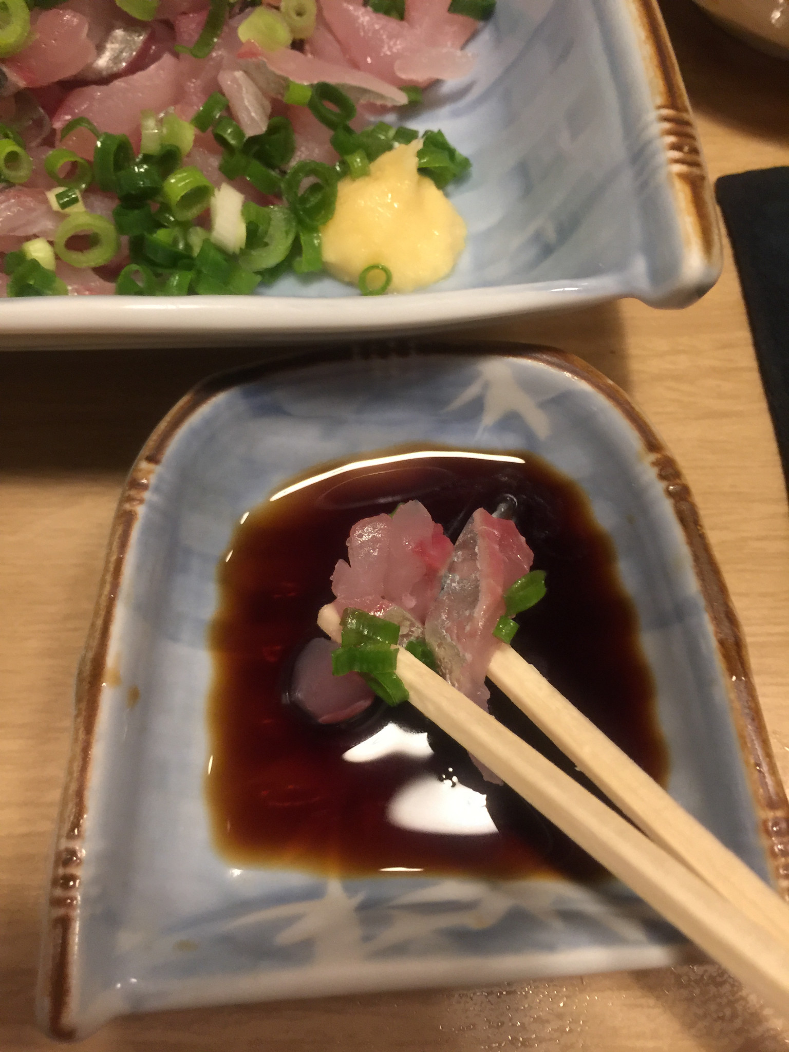 看着旁边人点了份鱼生,也点了一份,老板娘和我说的英语基本懂了一点,就是这个没有瓦萨米,不配芥末,倒是配了这种生姜味的蘸料,酱油自己倒