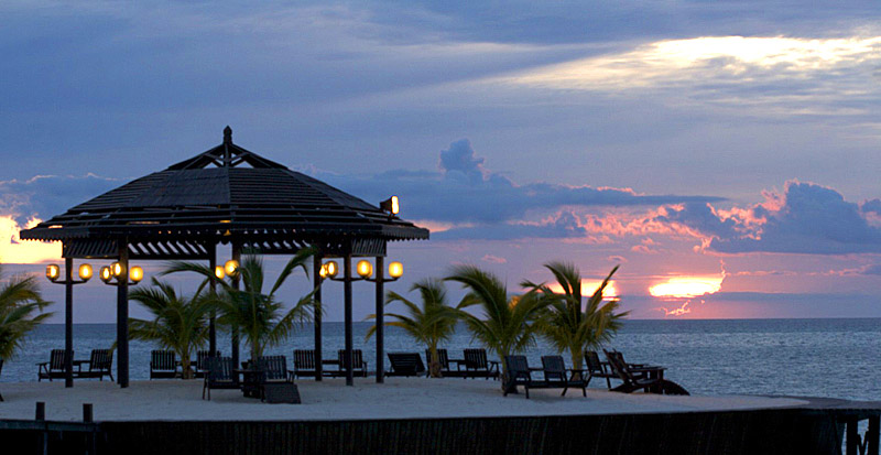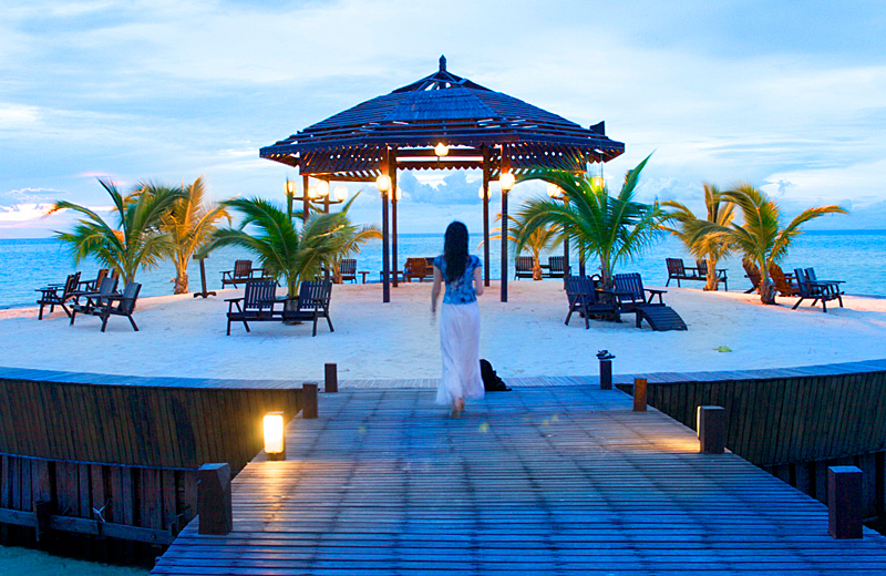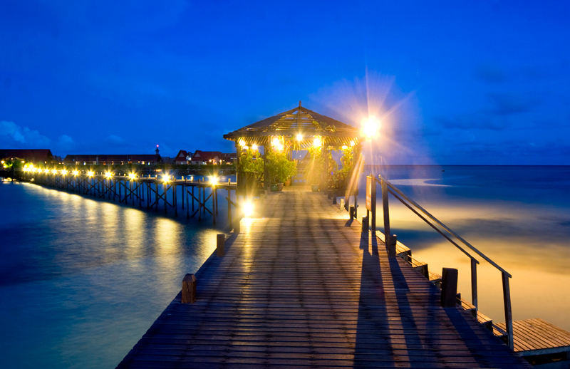 夕阳西 下的KAPALAI铺满细沙的人造岛。KAPALAI只有每日落潮时,才有一块月牙形的沙滩浮出海面,其余时间就请到度假村尽头的圆形环岛上欣赏无敌全海景吧。