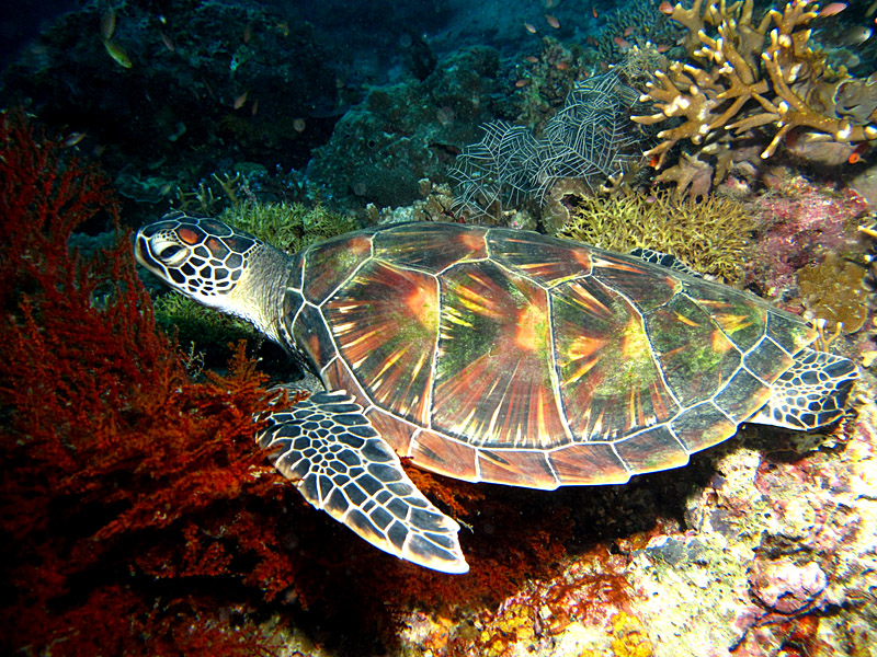 每天晚上都有十余只大海龟围着房间,不断的浮上水面换气.可惜那会儿光线太暗了.没法拍下来.那好大好重的喘气声,超级卡哇伊.