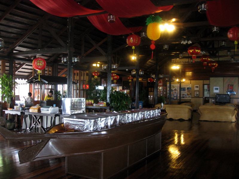 同样是三面环海的餐厅提供24小时饮品和点心。三餐的时间CHECK IN 时候会告诉你。早餐从凌晨五点就提供了,因为有深潜的潜客们很早就要离岛 了。餐和水果的种类还算可以,一周七天每天都会更换不重味,基本适合中国 客人的口味,调料都是东南亚 地区的甜酸口,有吃不惯的住的久的,可以带上一瓶老干妈辅助下。
