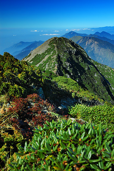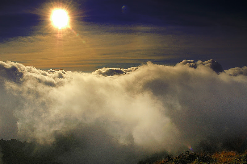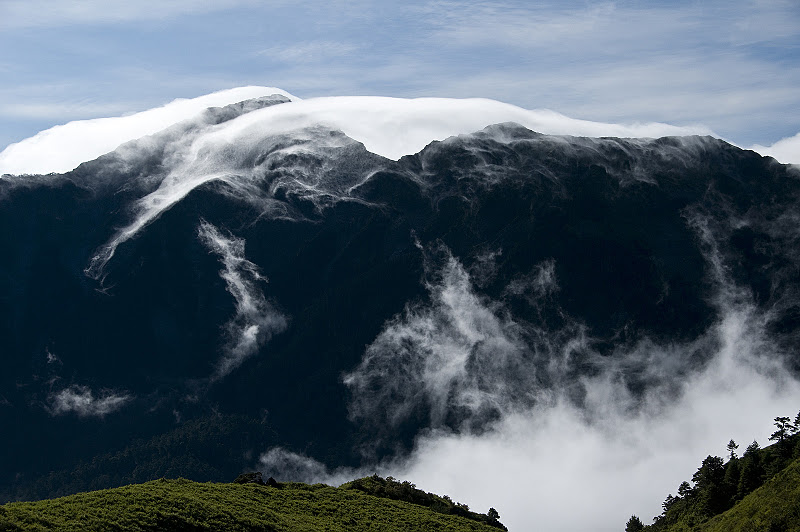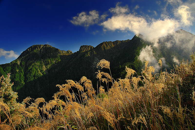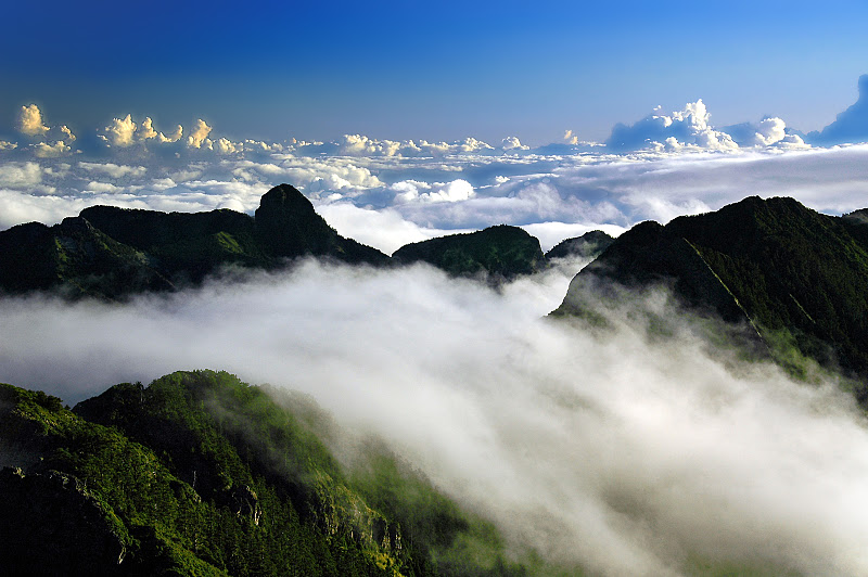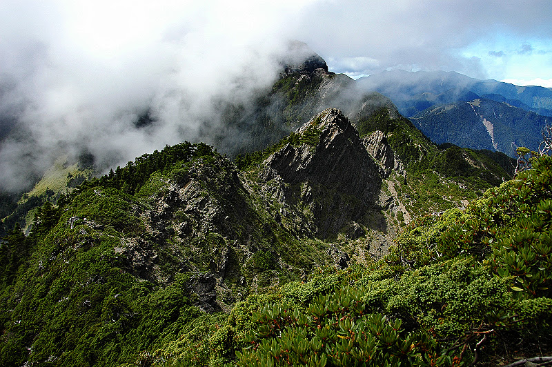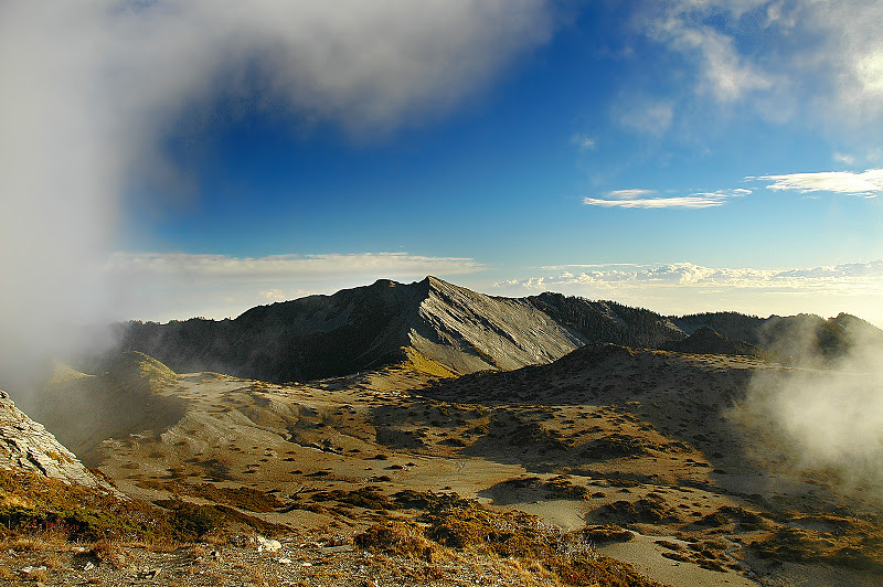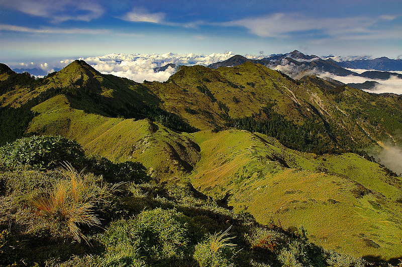 -- 凌志雲霄 -- 從玉山往南望向中央山脈的南一與南二段,一眼望去,整個台灣島像被一層厚厚的棉花覆蓋住,唯有幾座超過三千公尺的山頭才能露出頭來,整個台灣島在你腳下,豪情萬丈,凌志雲霄。 照片左方遠處尖尖的的山頭為南台首嶽『關山』。