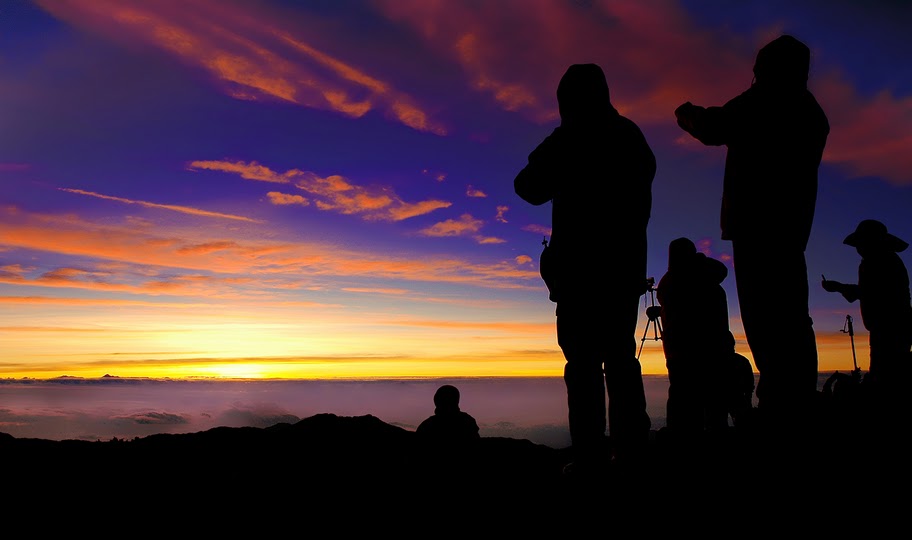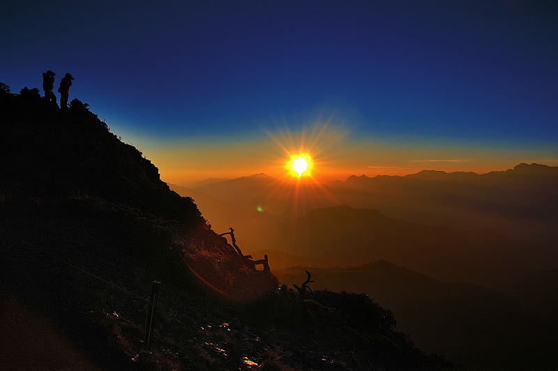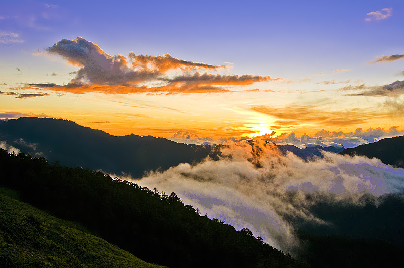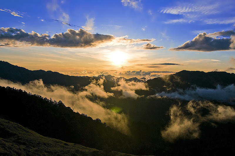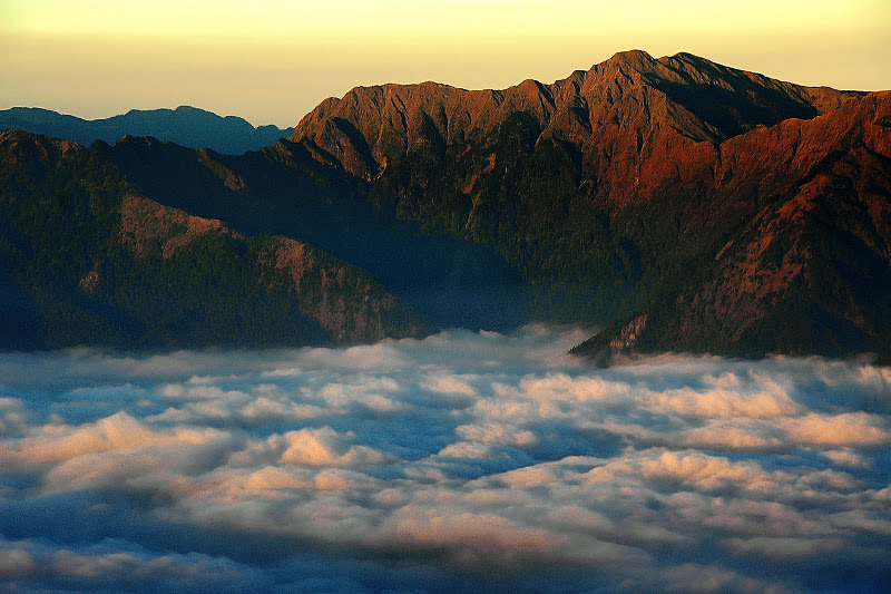-- 南湖夕照 -- 大多數人都喜歡晨昏的光影,短短數十分鐘,紅橙黃藍紫互相消長,瑞氣千條,變化無窮。 高山上因為空氣稀薄,空中懸浮粒子污染少,因此晨昏色彩的表現比平地來得更加精彩,再加上雲海的波濤陪襯,使得整張圖像的氣勢無與倫比,讓登山客在一天辛苦的旅行後,得到最大的慰藉。